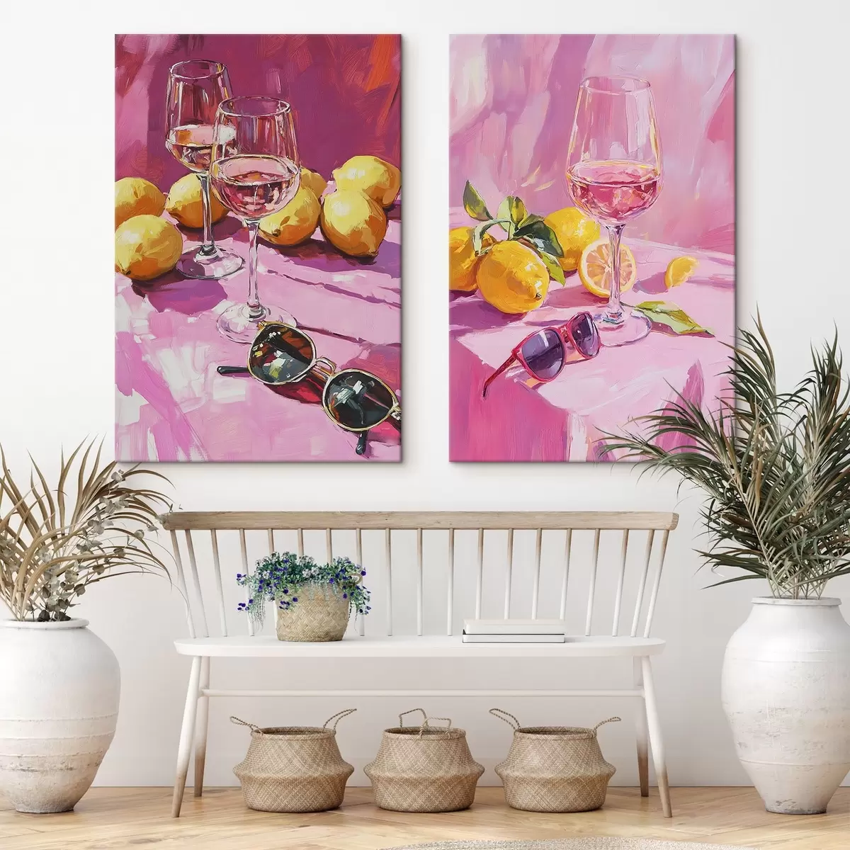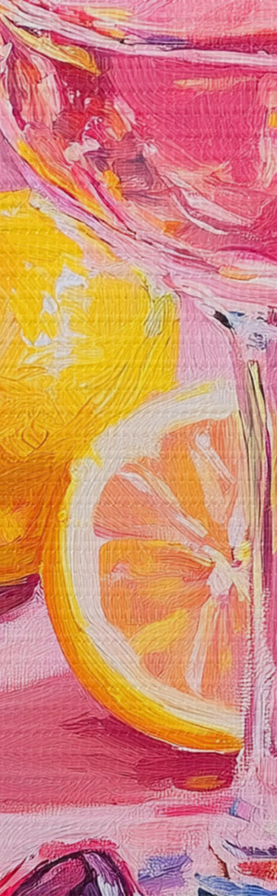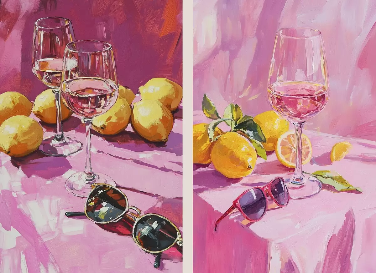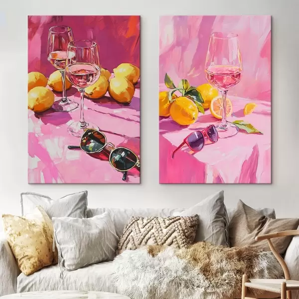 Picture Oil style abstraction with glasses of champagne, lemons and sunglasses, pink colors Nr m00444