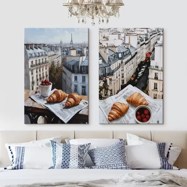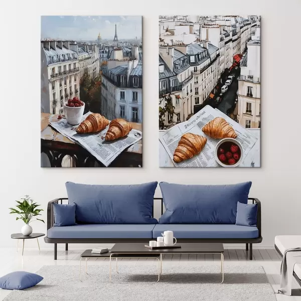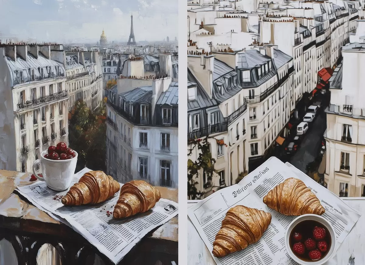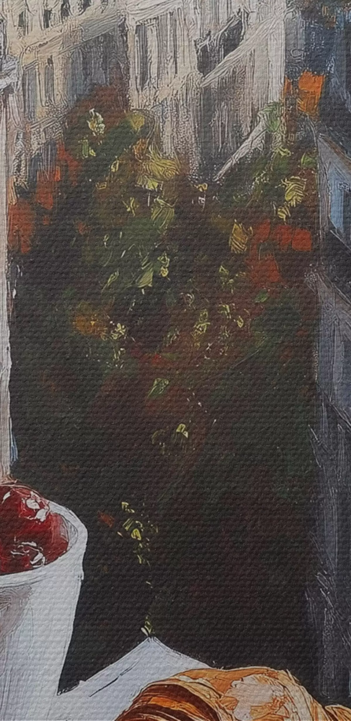 Picture City view on a balcony in Paris, Eiffel tower, strawberries, coffee, journal Nr m00445