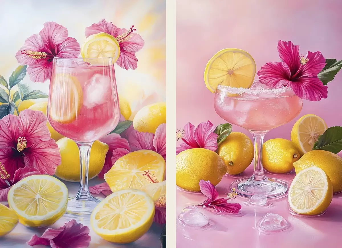 Picture Cocktails with hibiscus flowers and lemons, summer, juicy, watercolor style Nr m00446