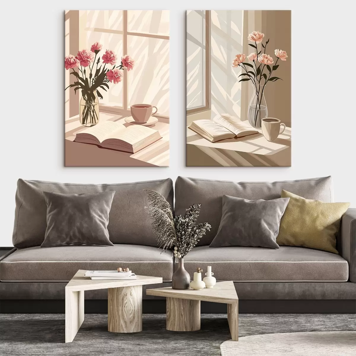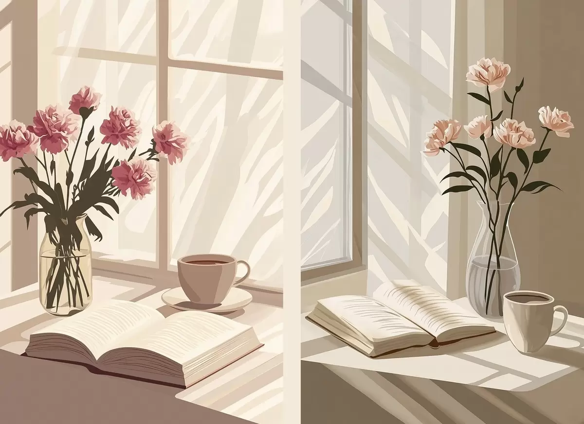 Picture Abstraction, morning aesthetics, cup of coffee, book, flowers Nr m00448