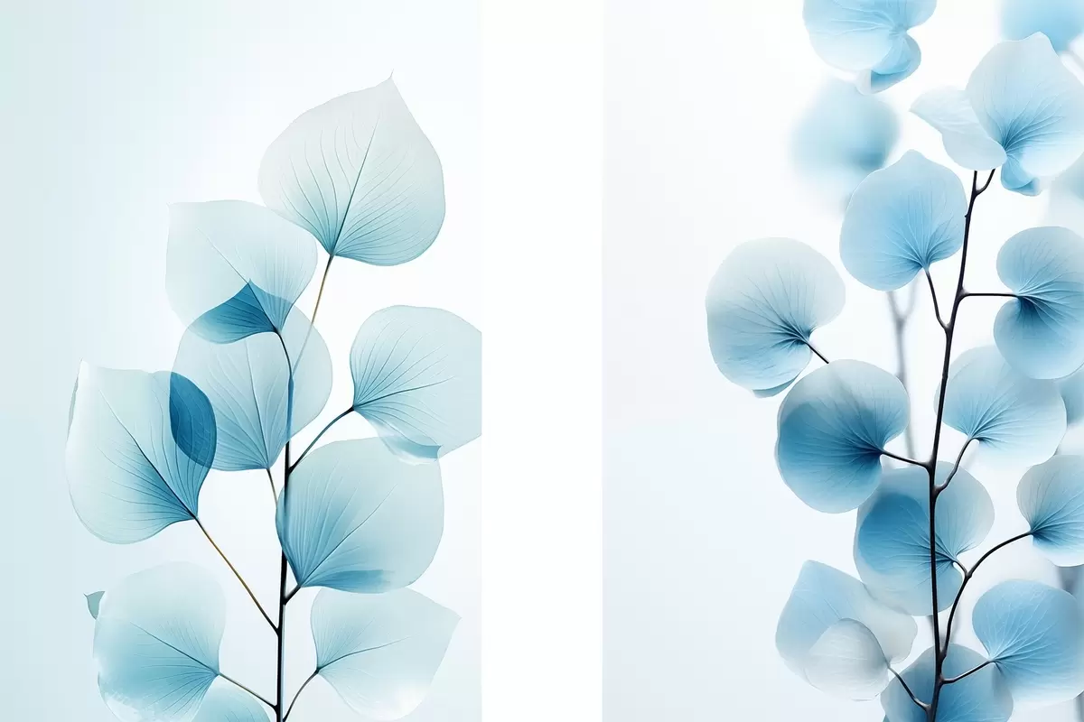 Picture Branch with translucent blue leaves, delicate veins visible, light and calm composition, minimalist aesthetic Nr m00522