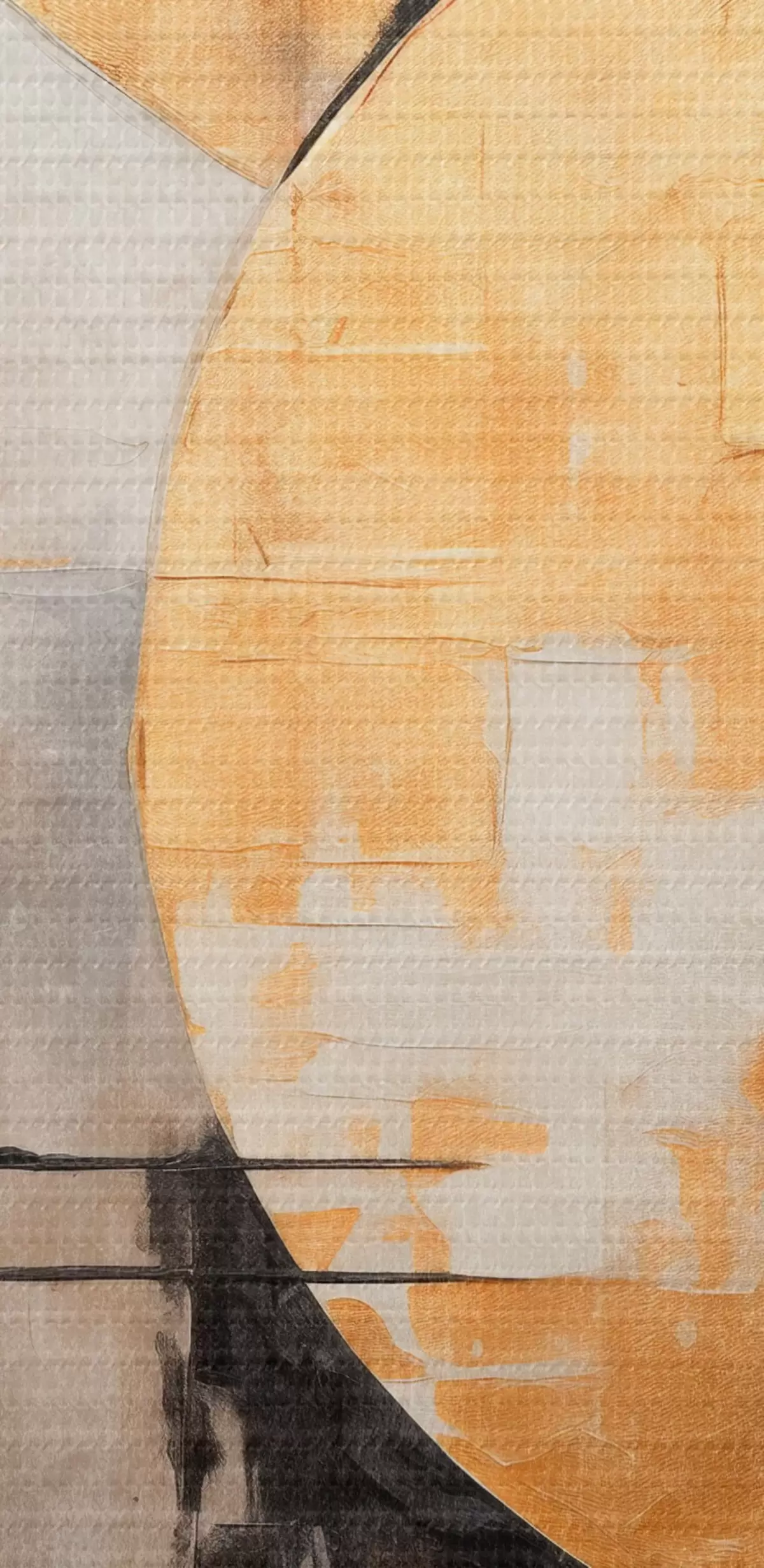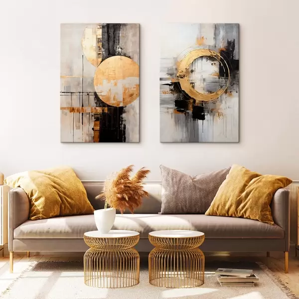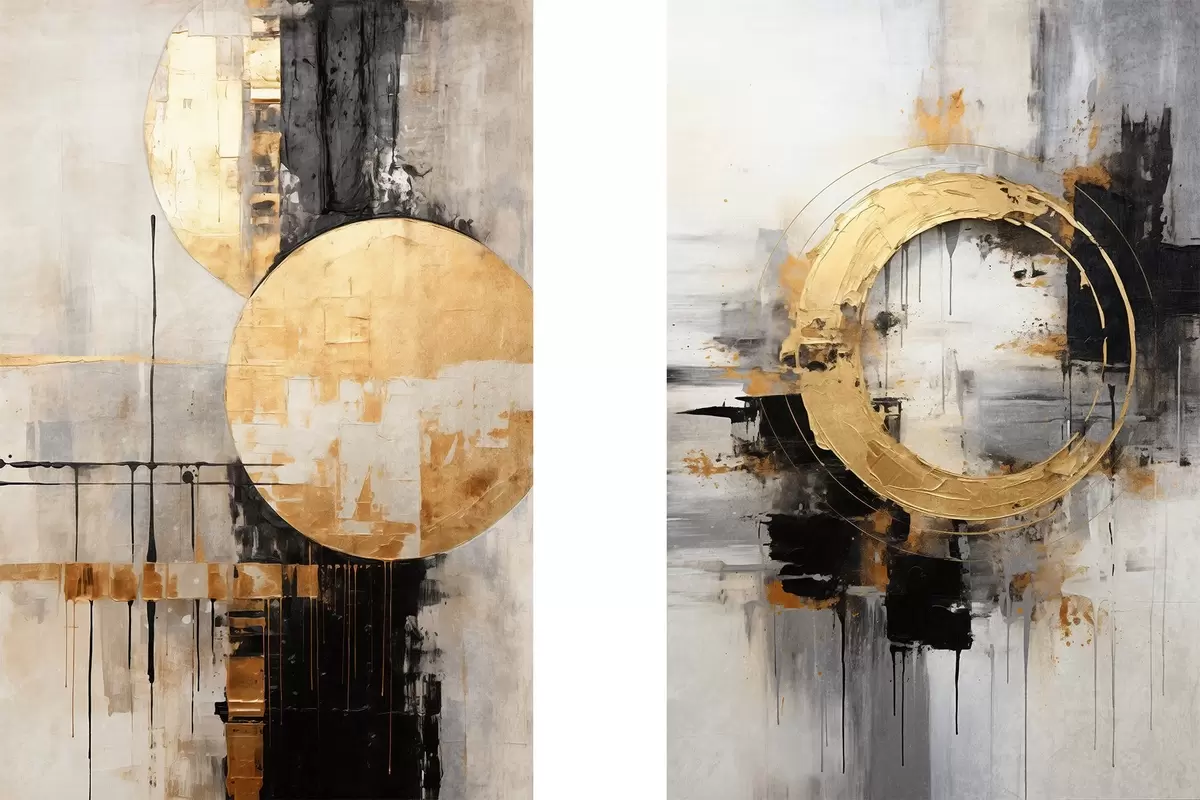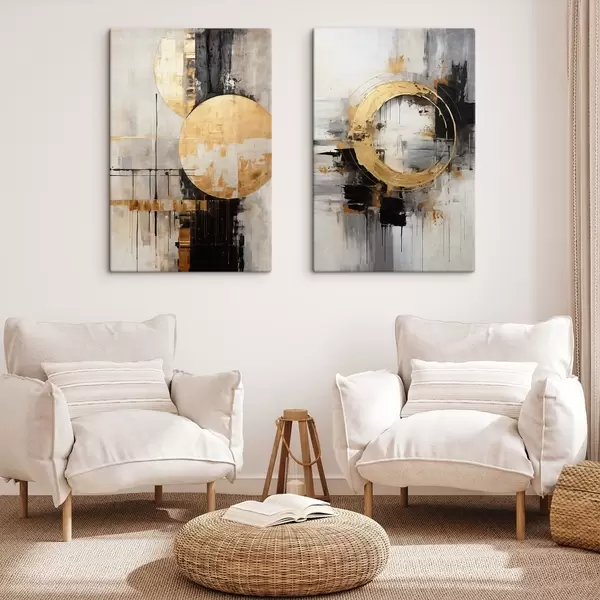 Picture Abstract painting with circles, black and yellow lines, and a background with gray and white tones Nr m00527