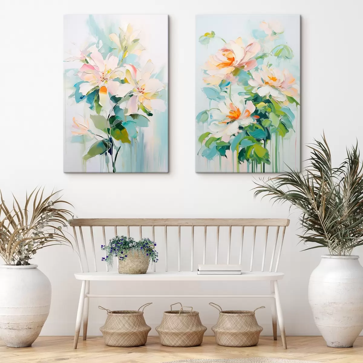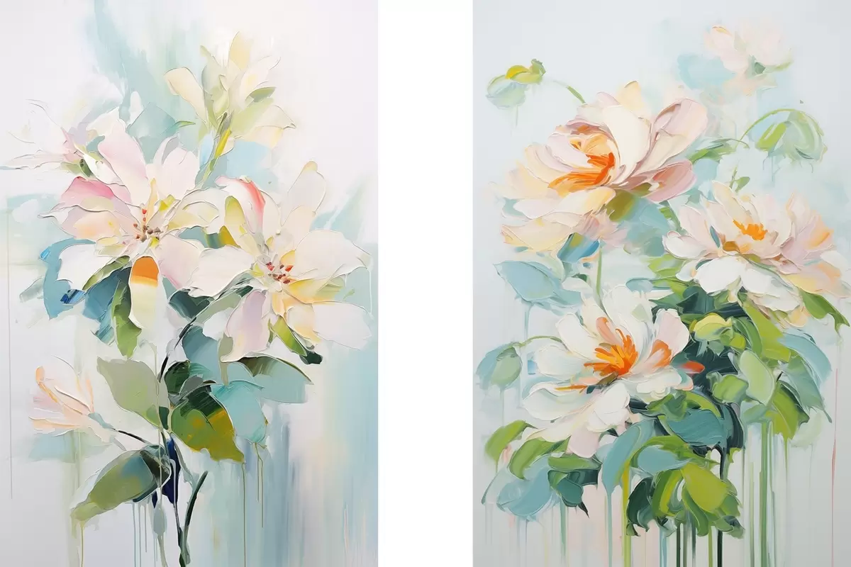 Picture White and pastel peach flowers, green leaves, soft brushstrokes oil painting imitation, light blue background Nr m00644