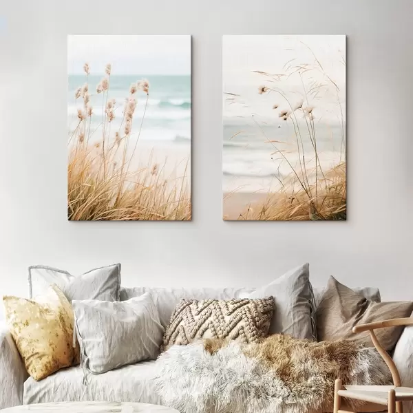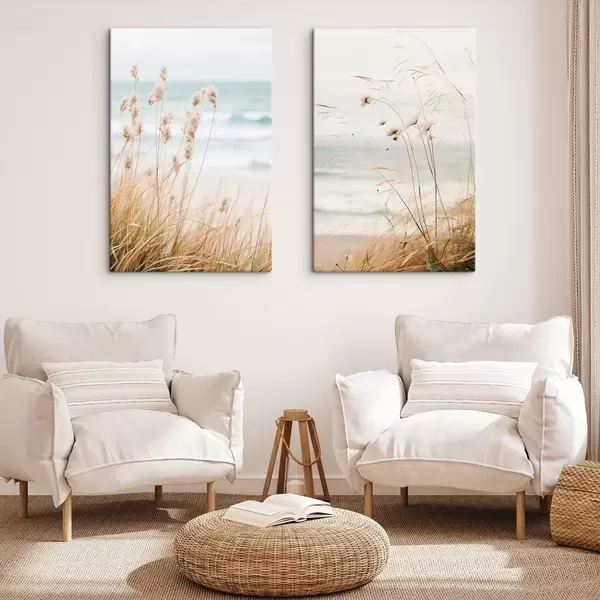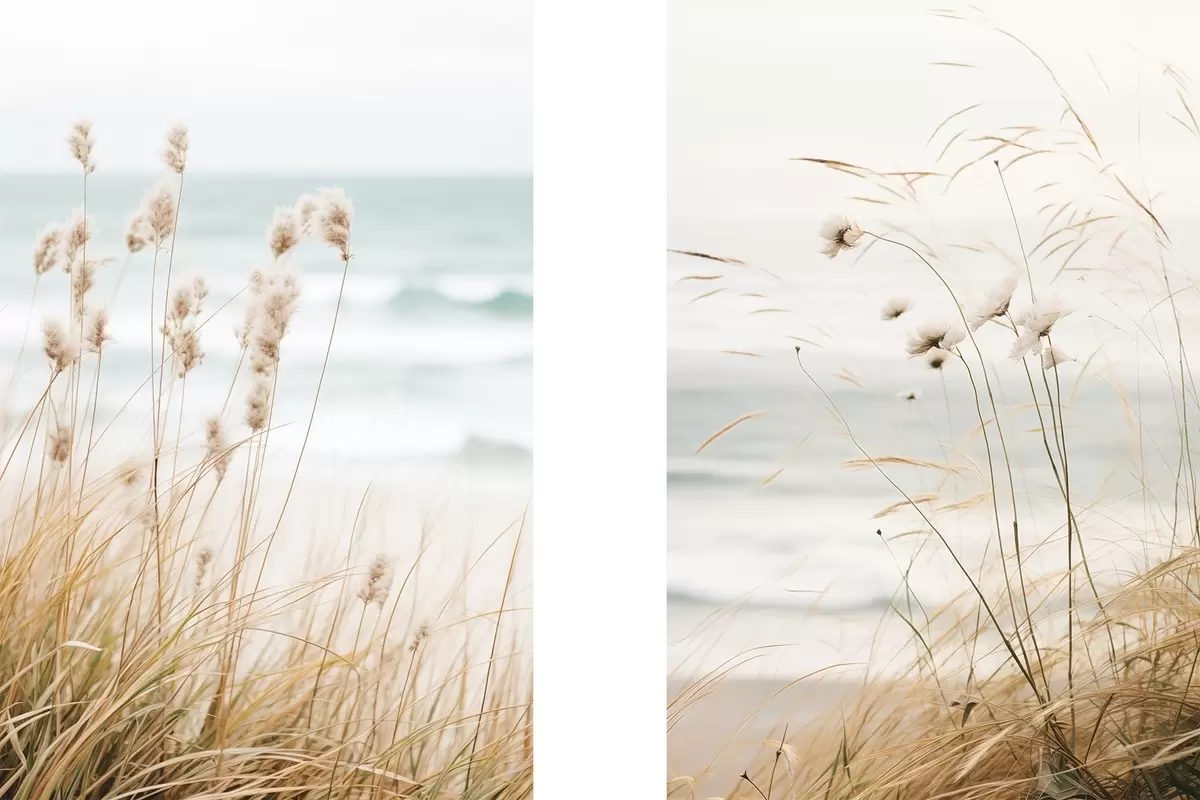 Picture Tall grass with fluffy seed heads, sandy beach and ocean waves in the background, soft and muted color palette Nr m00650