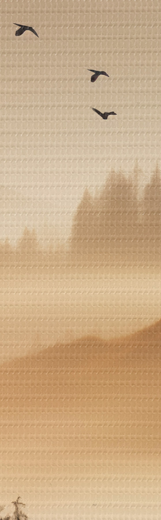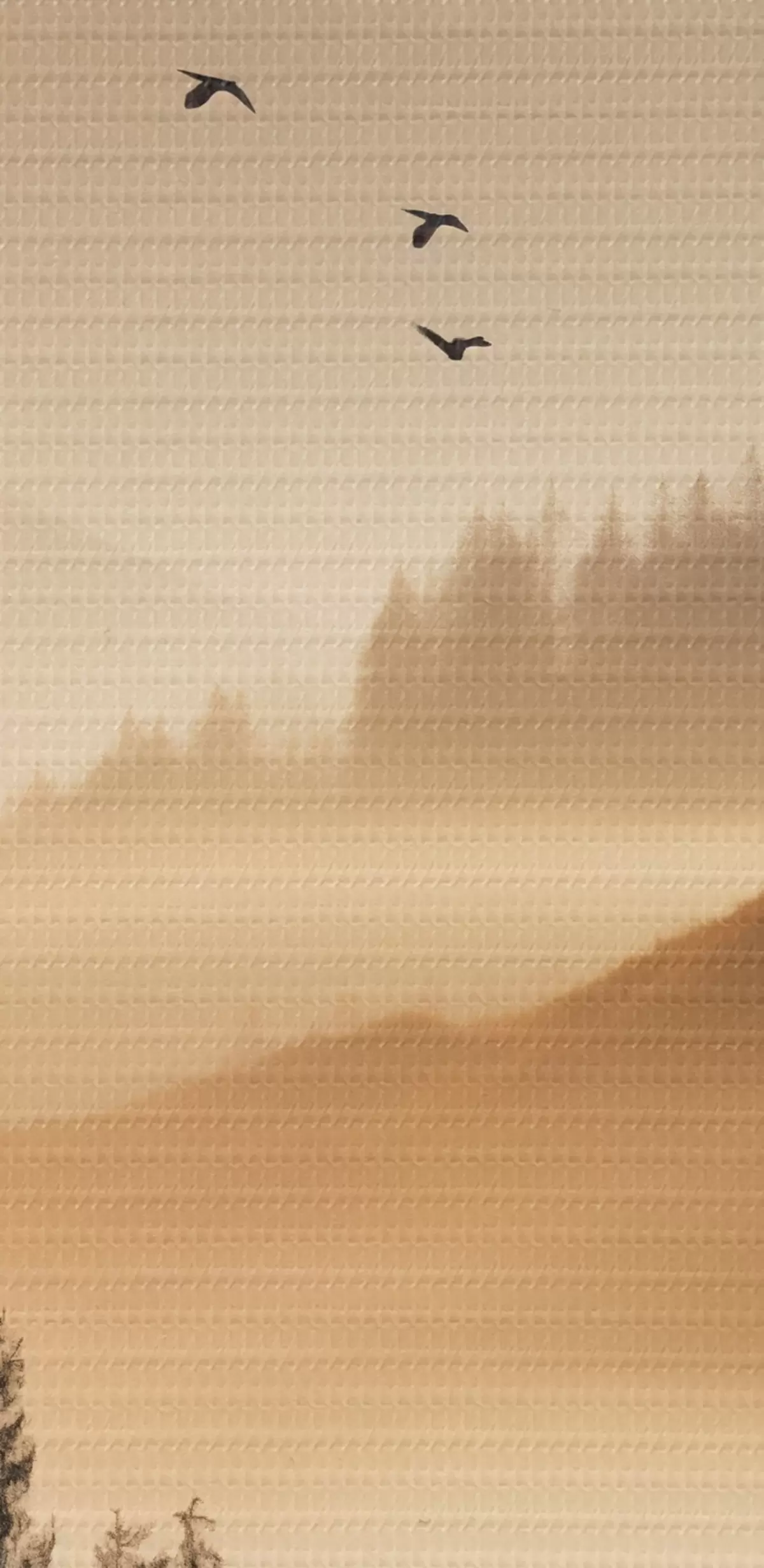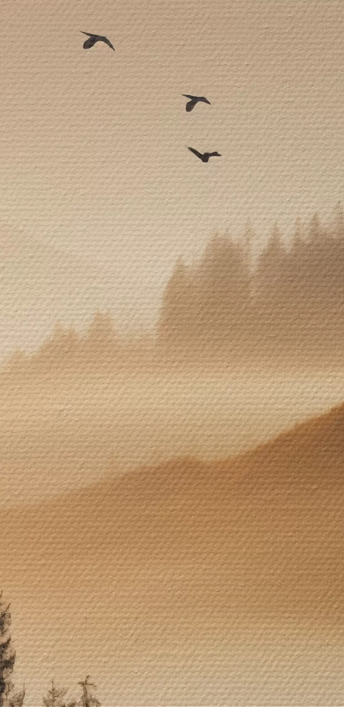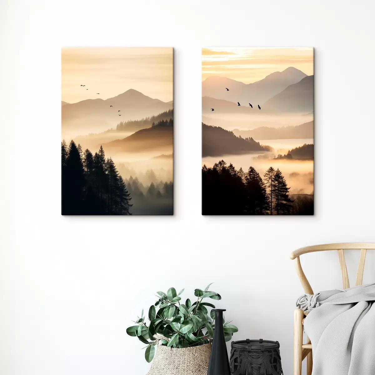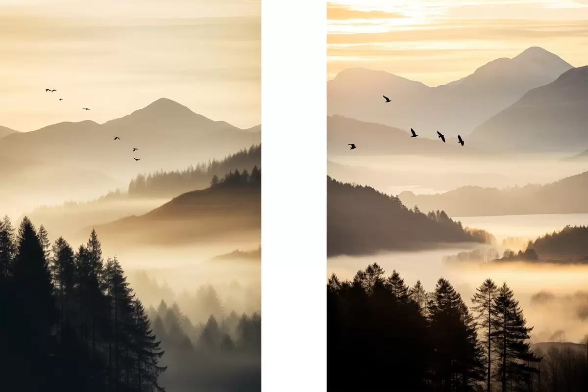 Picture A mountain landscape with a forest and birds flying in the sky , all covered in a thick layer of fog during sunrise Nr m00651