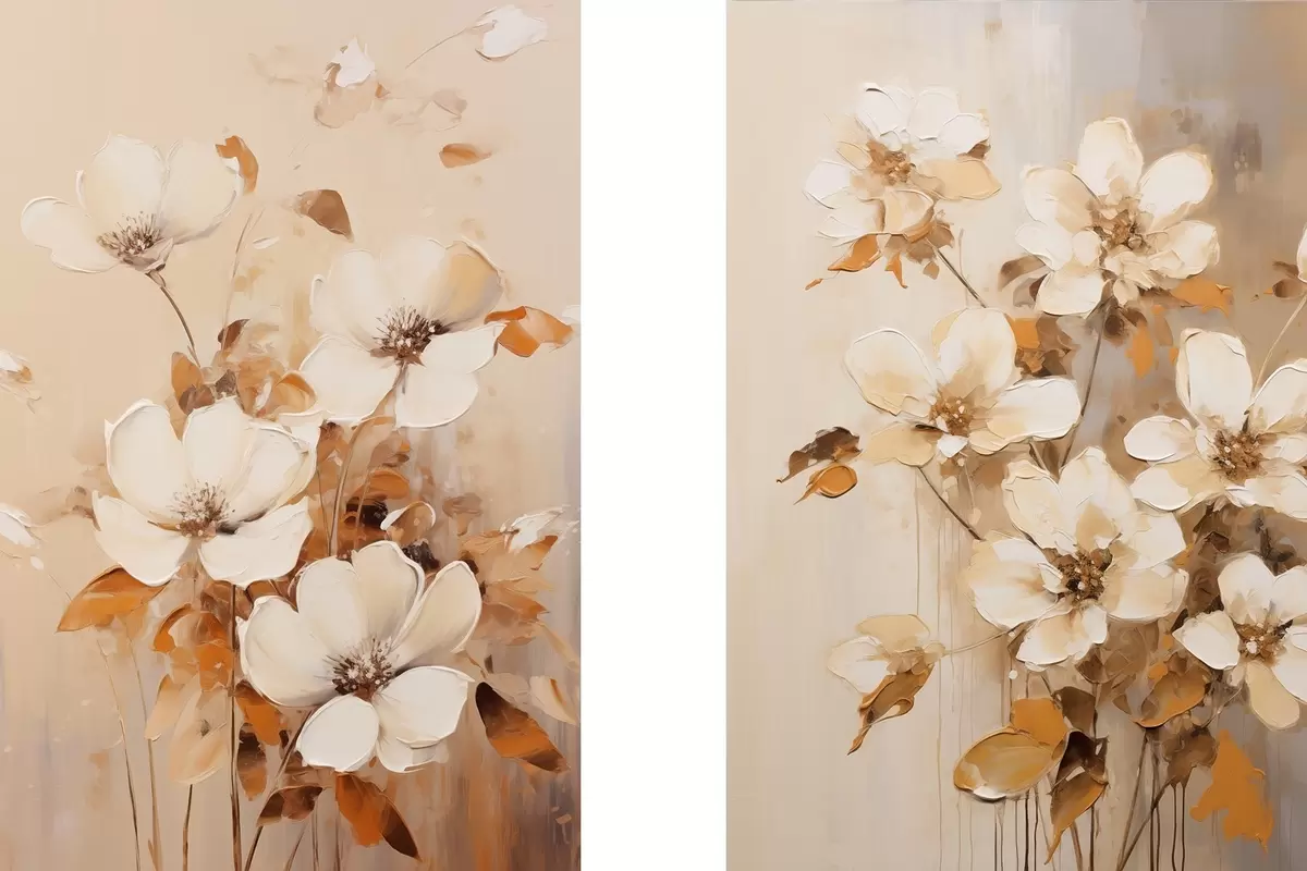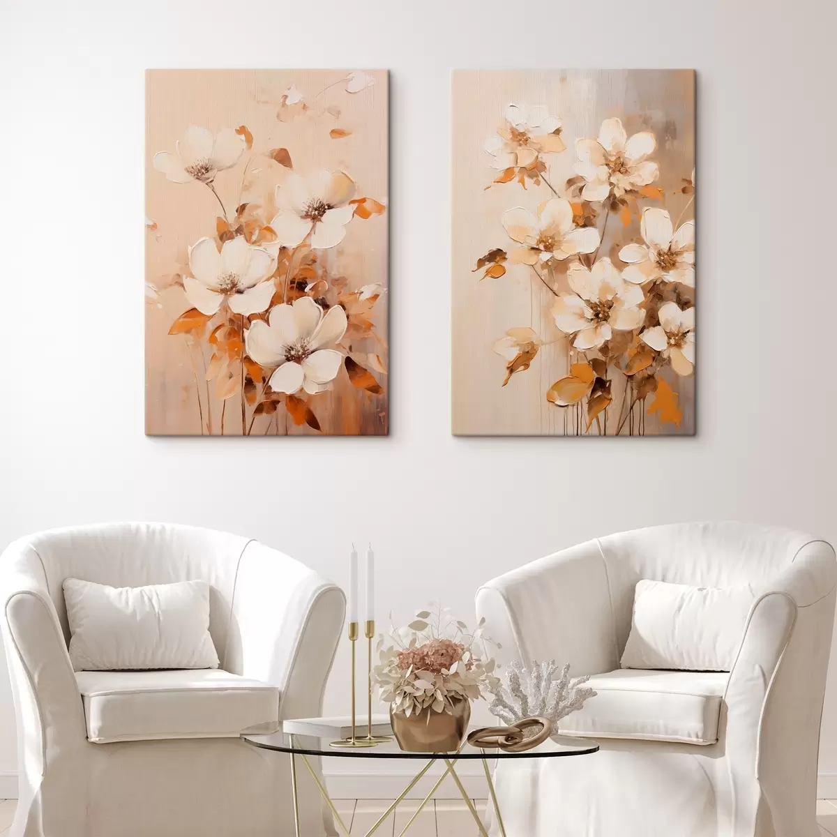 Picture White flowers with orange leaves, delicate brushstrokes, warm color palette, elegant composition Nr m00656