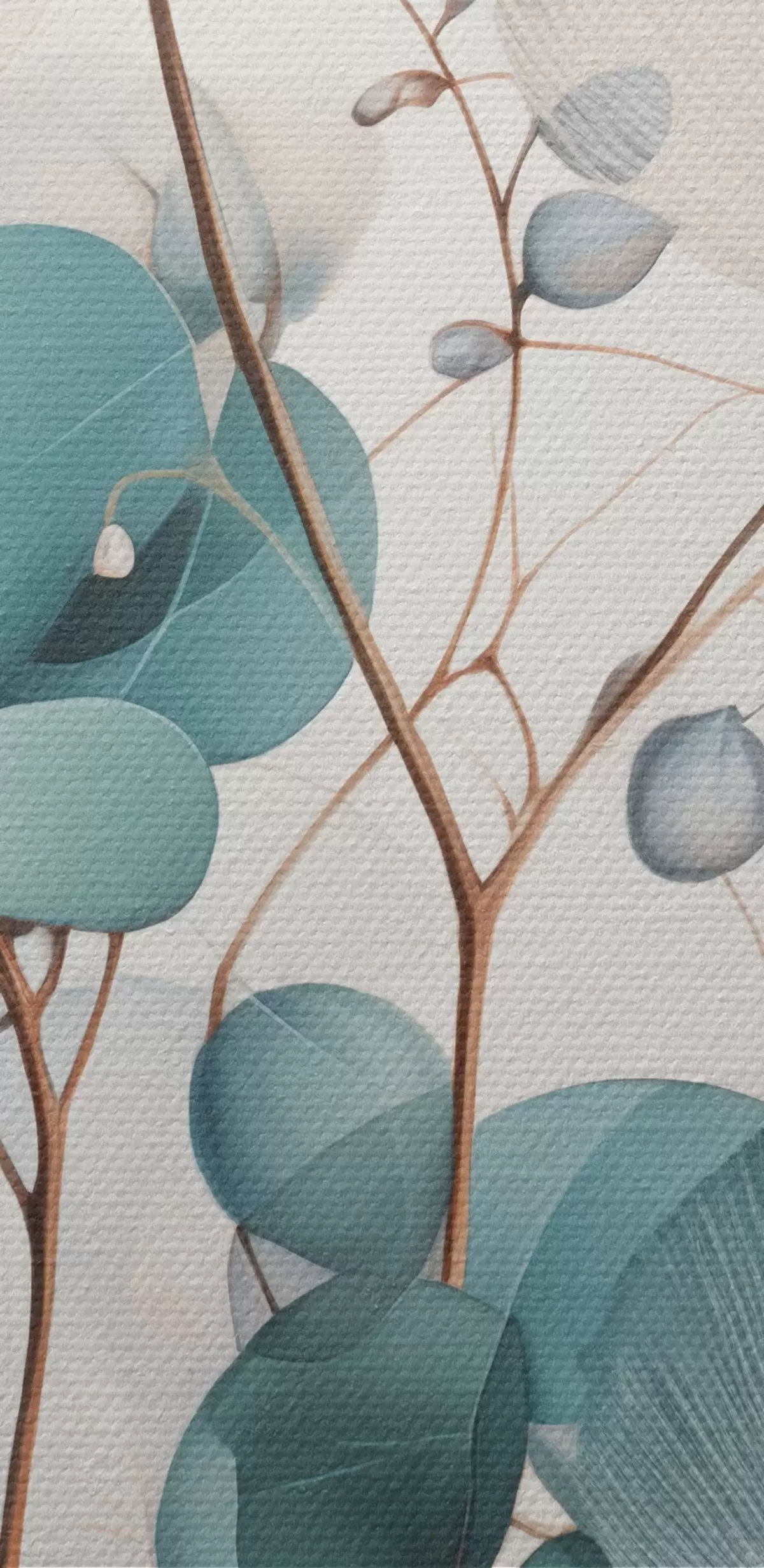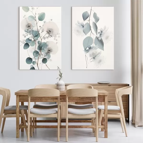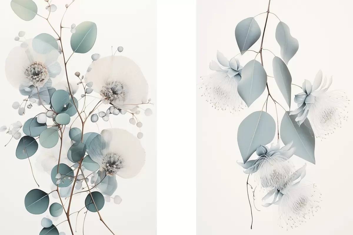 Picture Eucalyptus branch with blue leaves and white flowers, light background Nr m00829