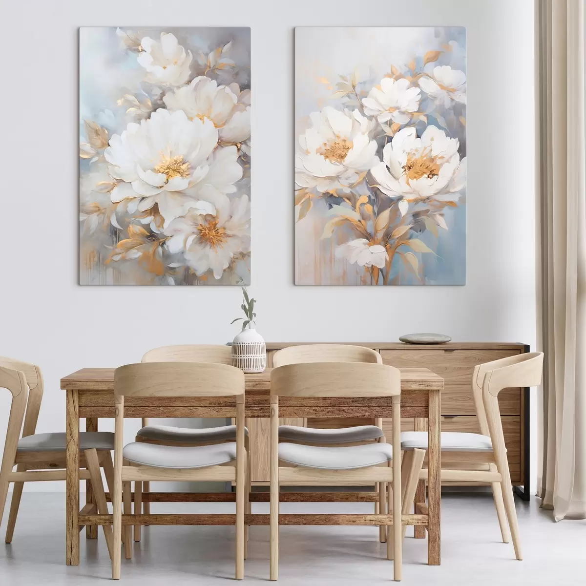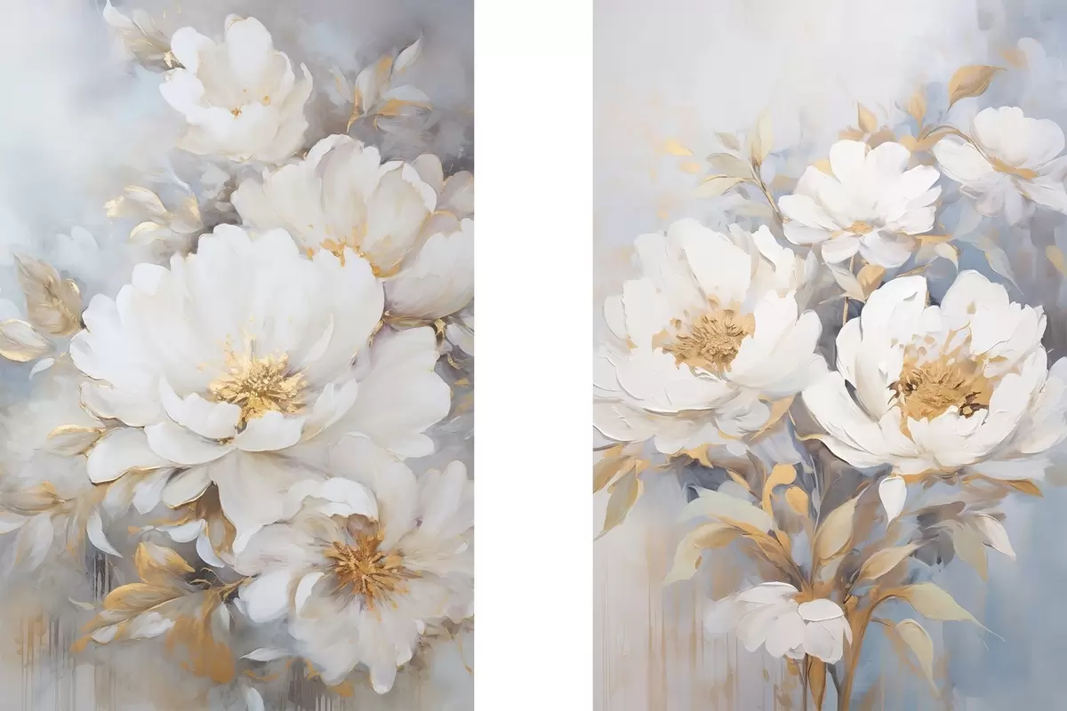 Picture White peonies with yellow centers and leaves, soft brushstrokes, light blue background, floral arrangement Nr m00878