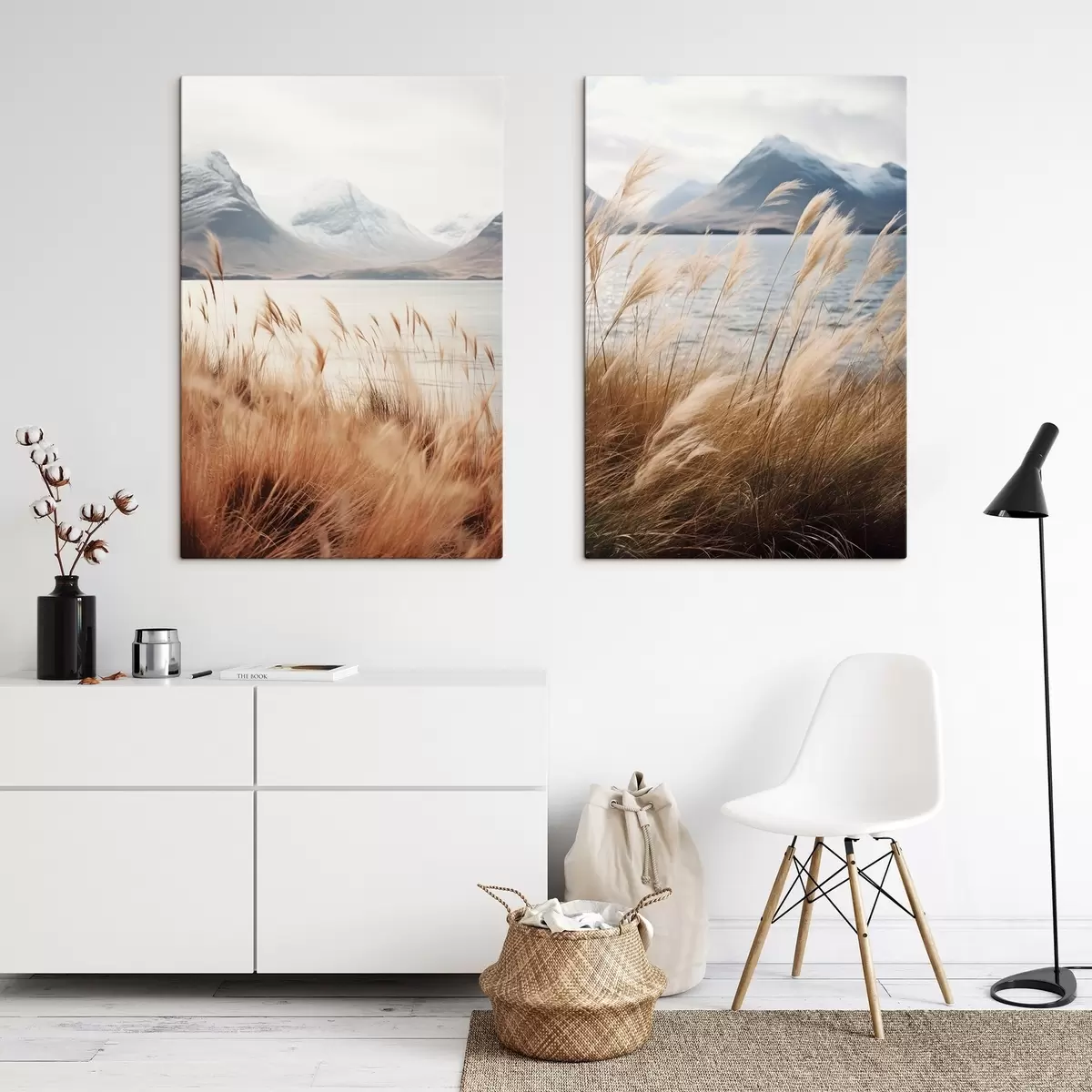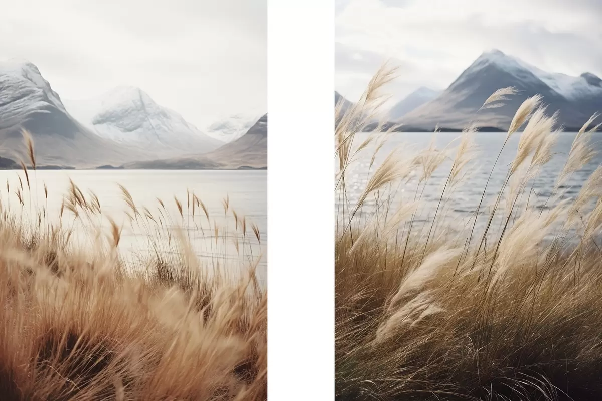 Picture Pampas grass with a lake and mountains in the background, soft lighting, muted colors, naturalistic style Nr m00884