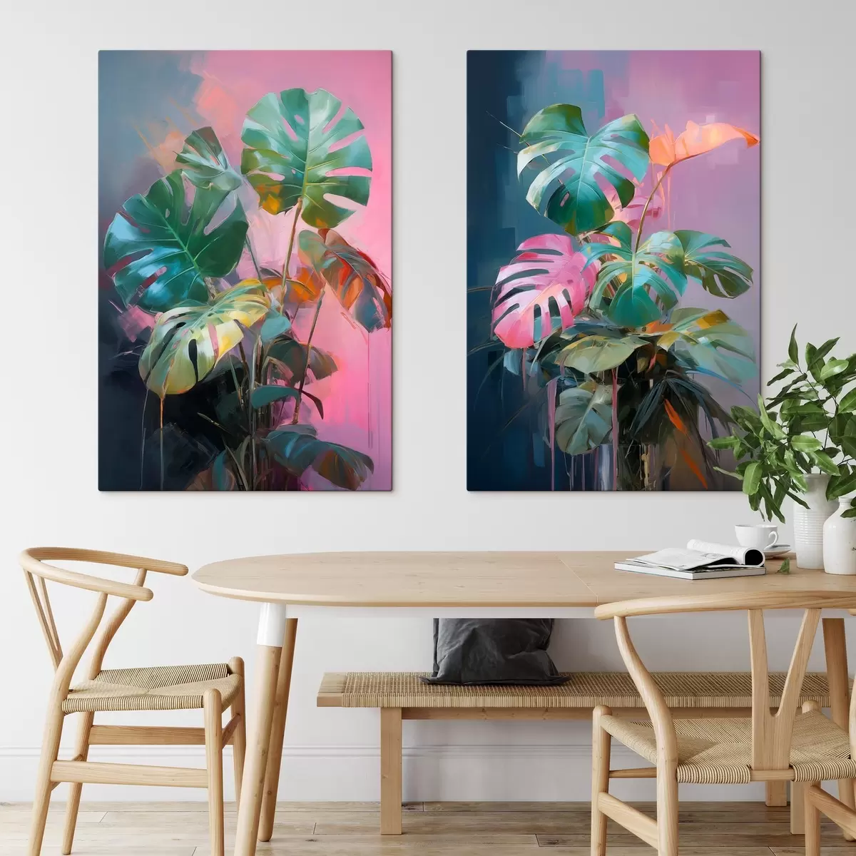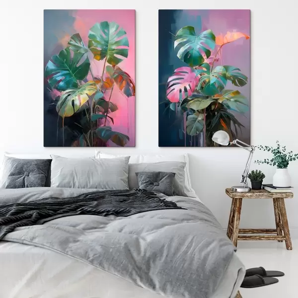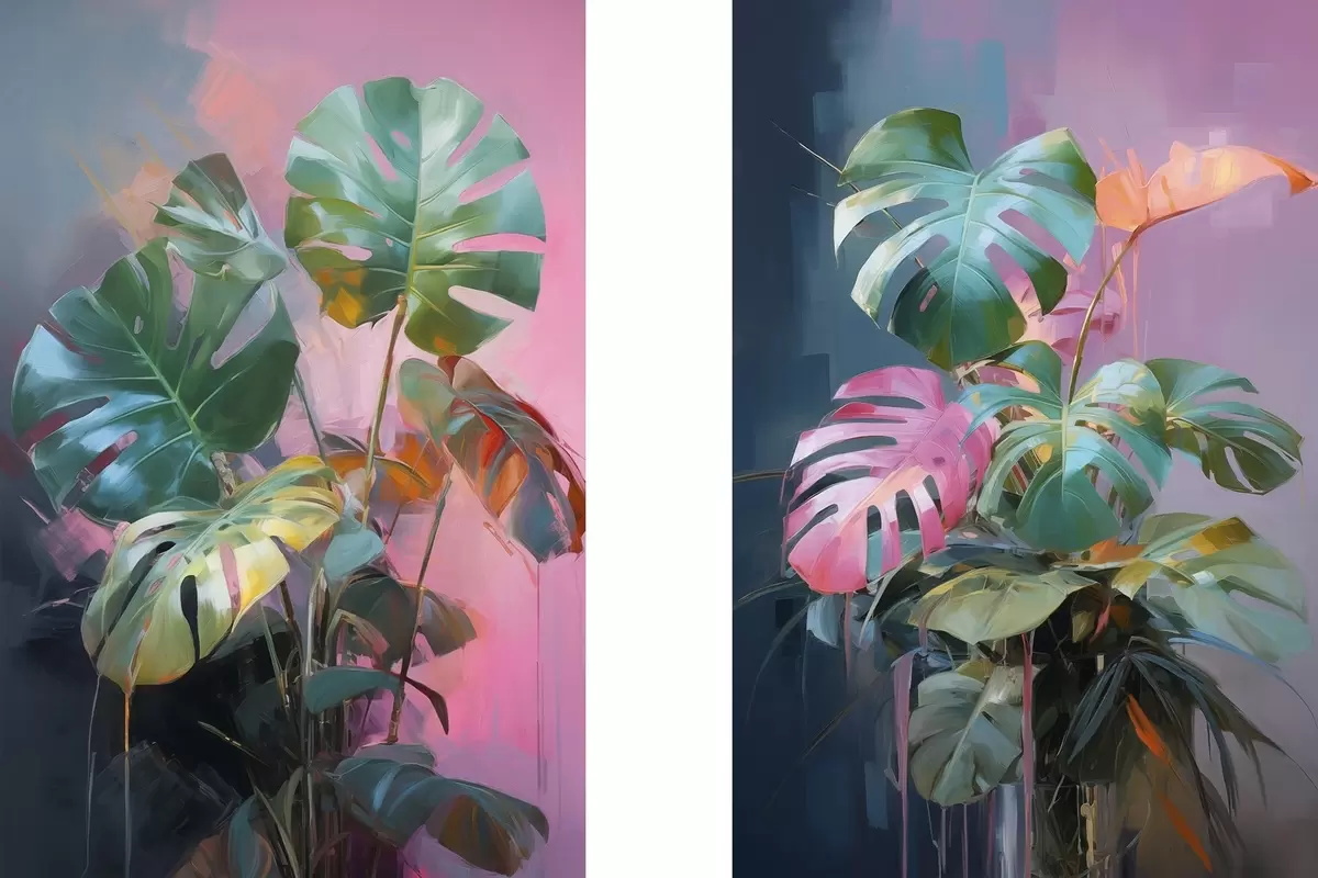 Picture Abstract monstera plant with vibrant green leaves, against a backdrop of soft pink and purple hues Nr m00886