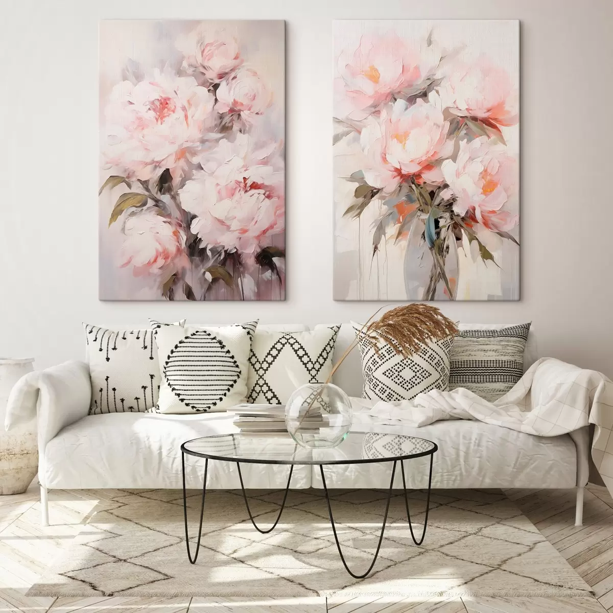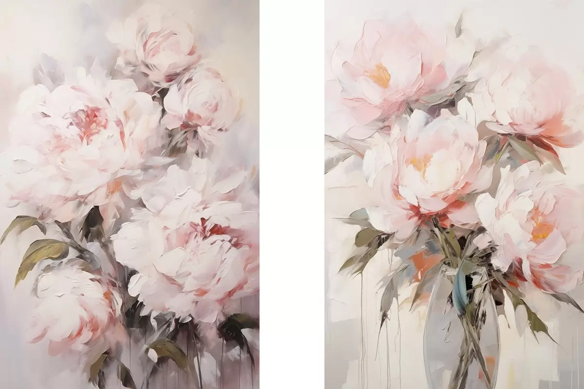 Picture A bouquet of light pink peonies with green leaves, soft brushstrokes, pastel colors, on a light background Nr m00890
