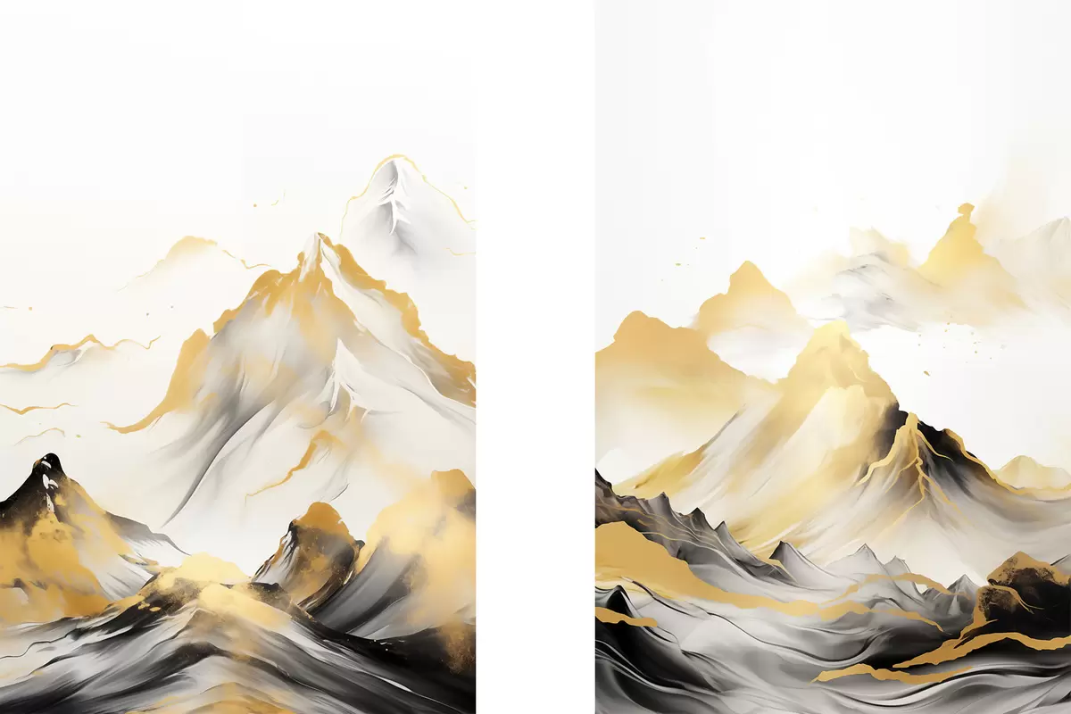 Picture Textured yellow and black mountains with snowy peaks, ink wash painting style, minimalist mountain range Nr m01002