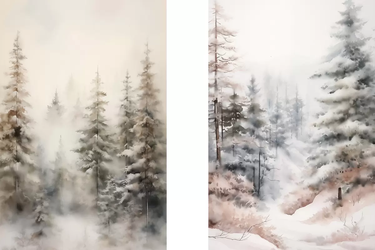 Picture Tall pine trees covered in snow, standing in a foggy forest, a soft, muted wintery scene Nr m01011