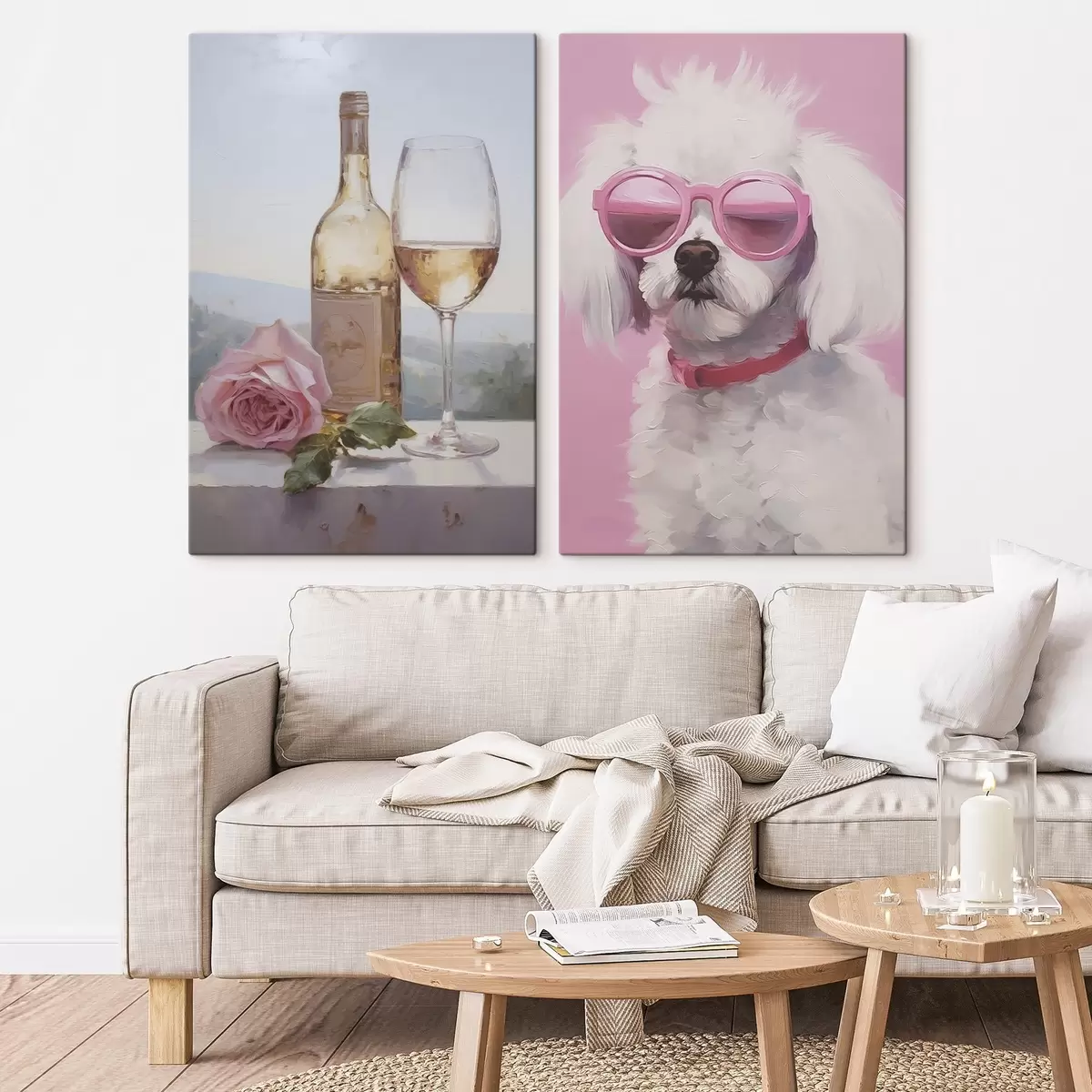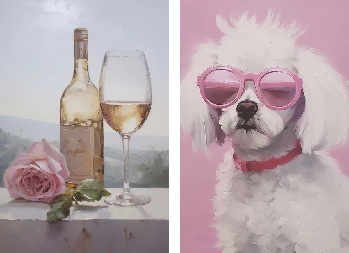 Picture A bottle and a glass of wine and a poodle wearing glasses, imitation painting Nr m01021