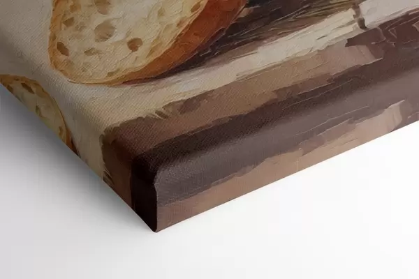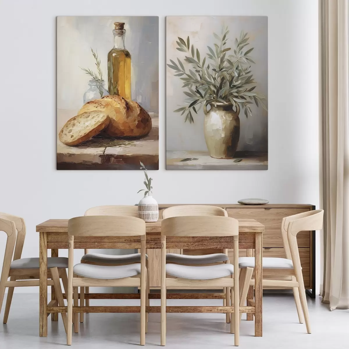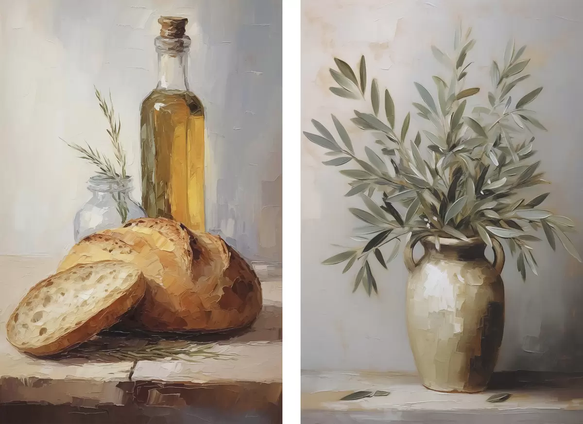 Picture Olive branches in a vase, bread and a bottle of oil, imitation painting Nr m01035