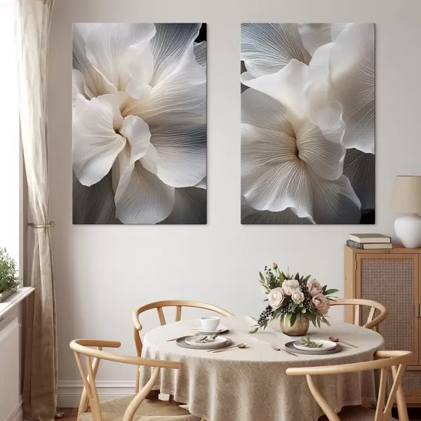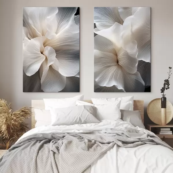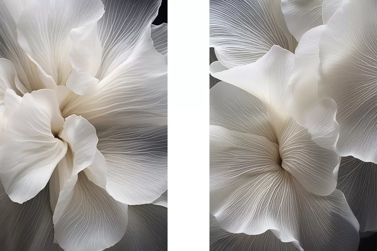 Picture Close-up of delicate abstract white floral petals with intricate lines and a blurred dark background Nr m01117
