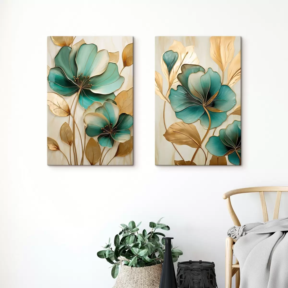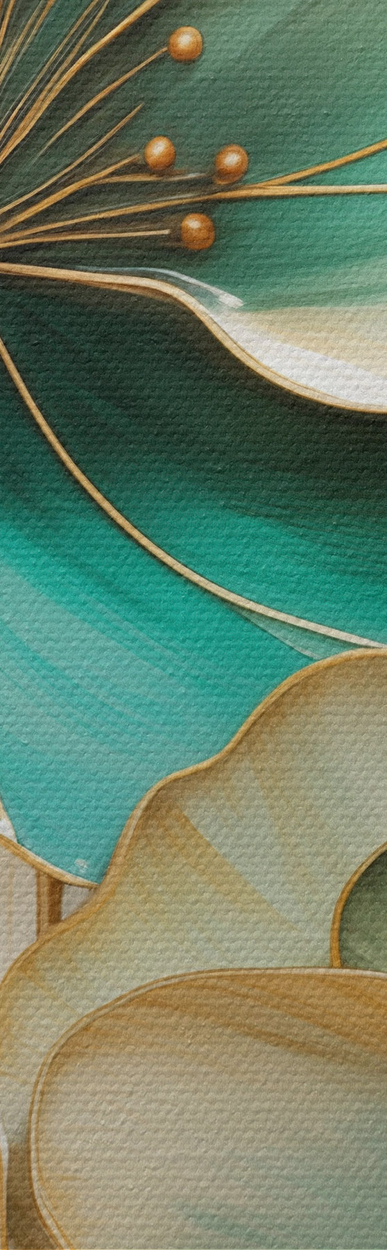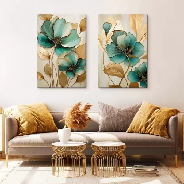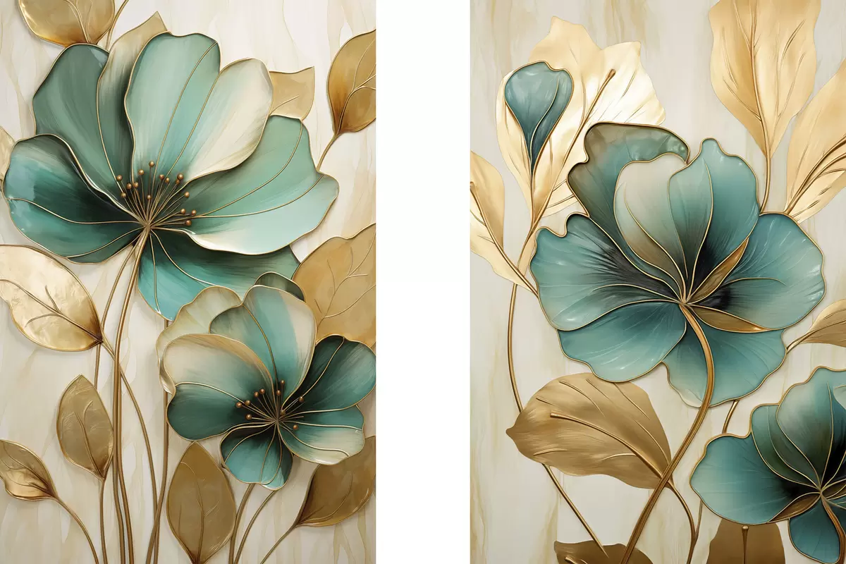Picture Large teal and yellow flowers with outlines, surrounded by yellow leaves against abstract background Nr m01235