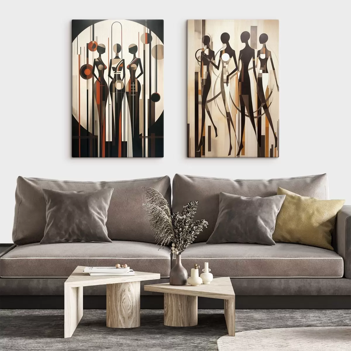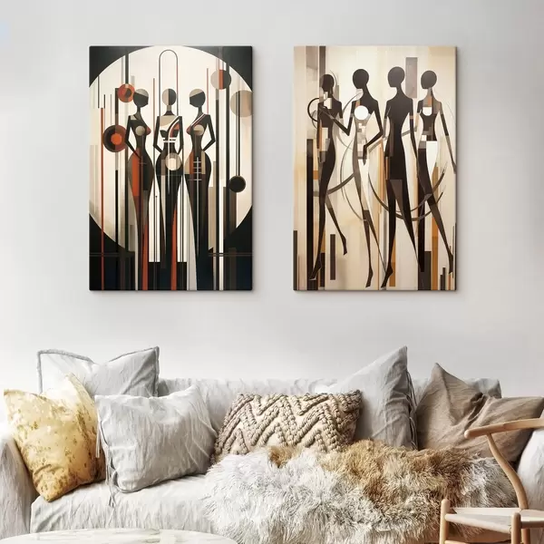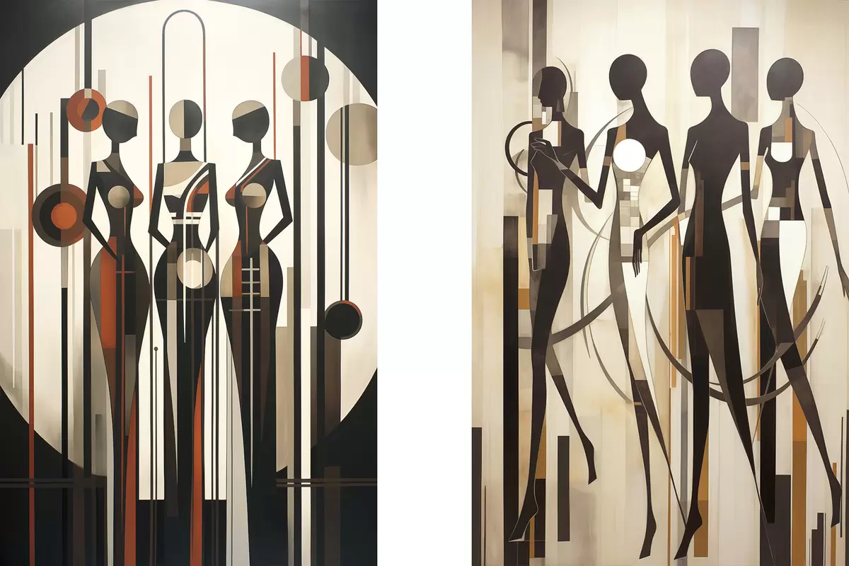 Picture Stylized female figures with geometric elements against an abstract background of vertical lines and circles Nr m01237