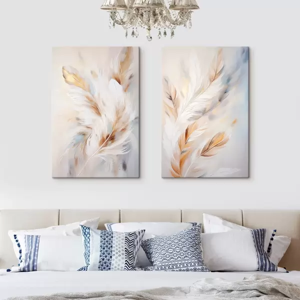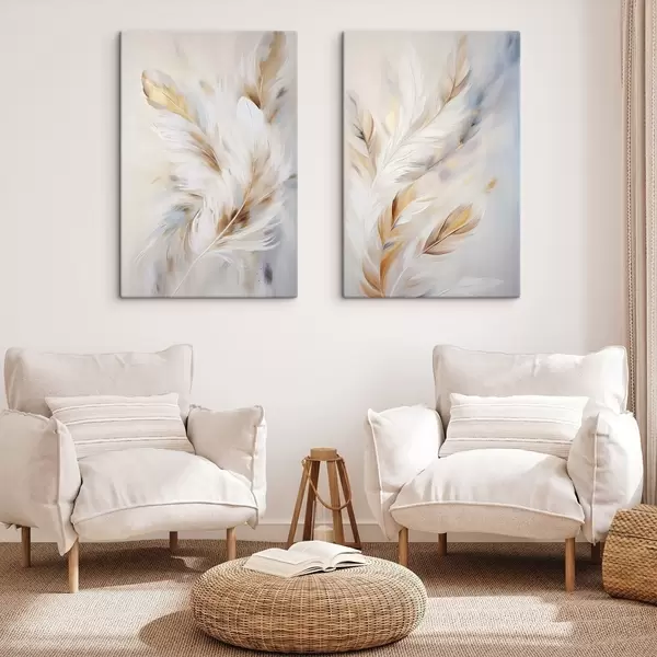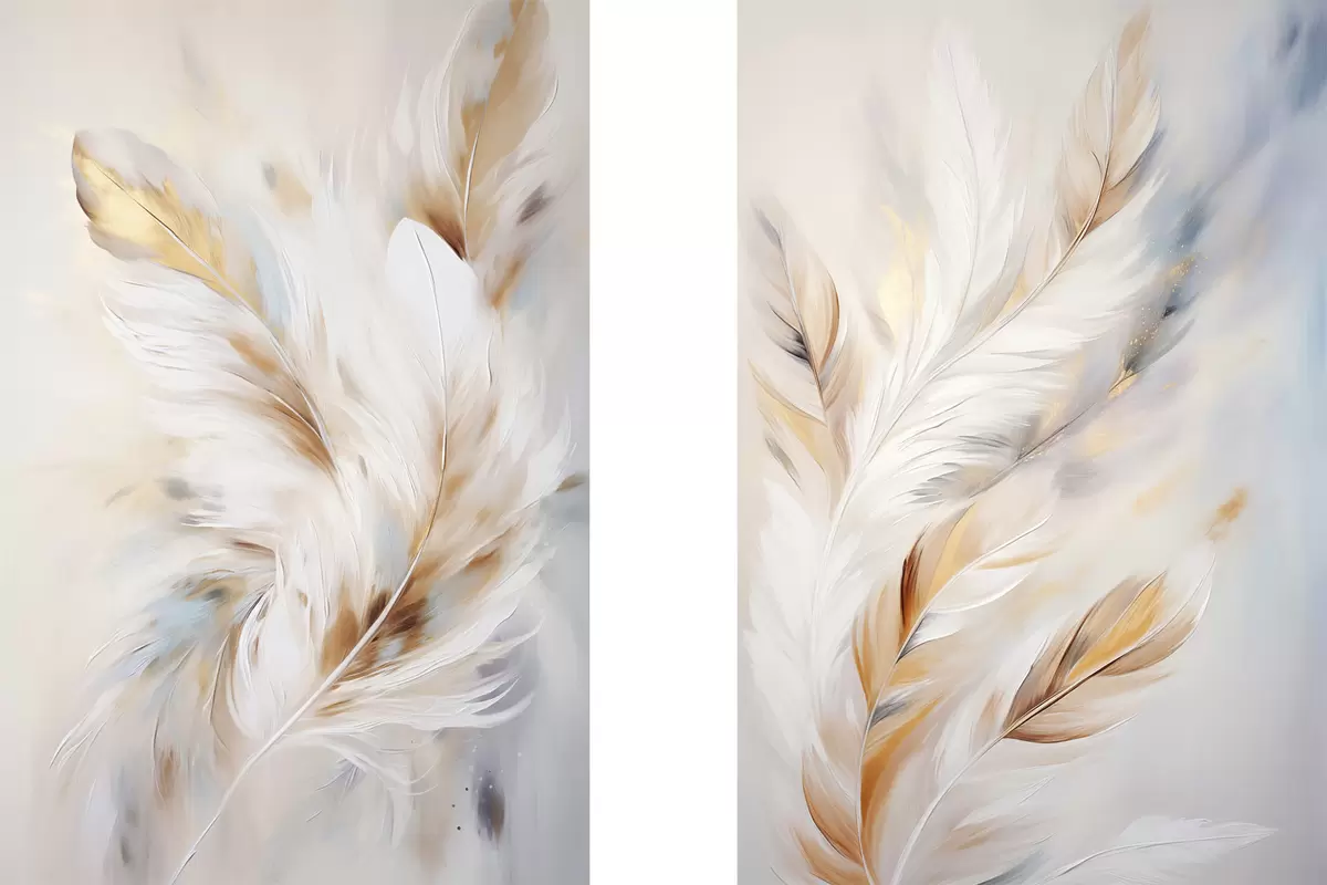 Picture Large, soft feathers with a blend of white, yellow and brown hues, against a light, abstract background Nr m01247