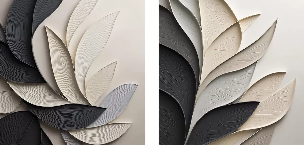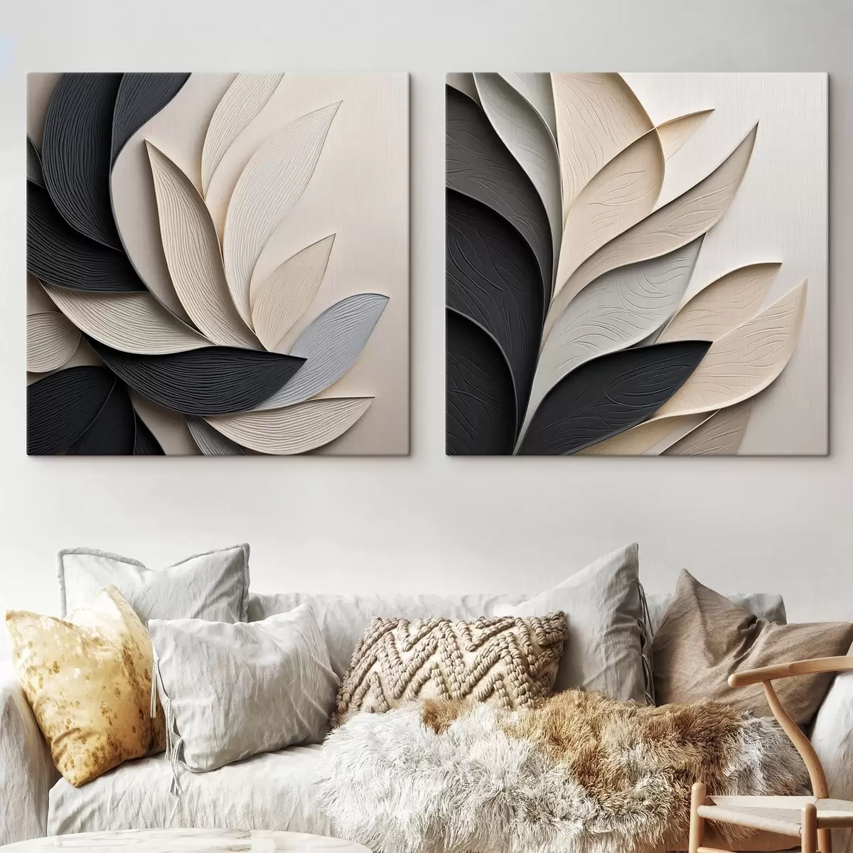 Picture Abstract composition of layered leaves, curved shapes in black, white and beige, textured art Nr m30195