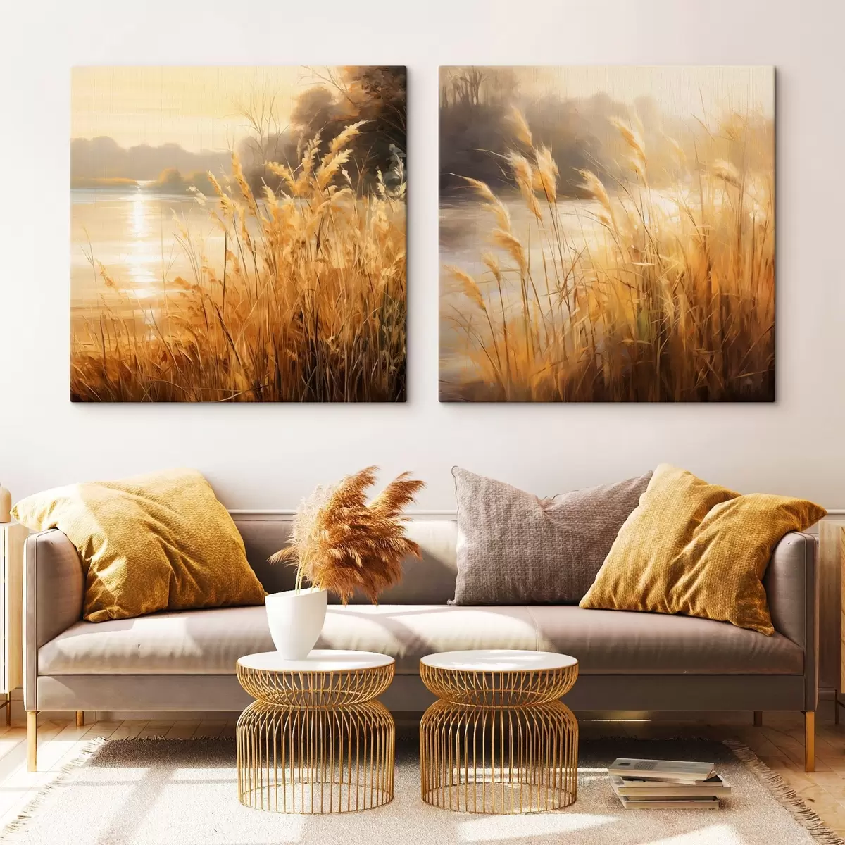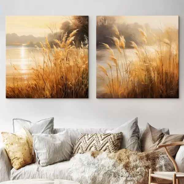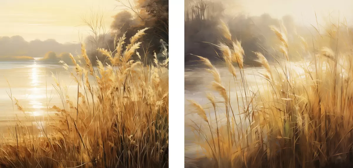 Picture Tall, dry spikelets grass in the foreground with a lake and trees in the background Nr m30201