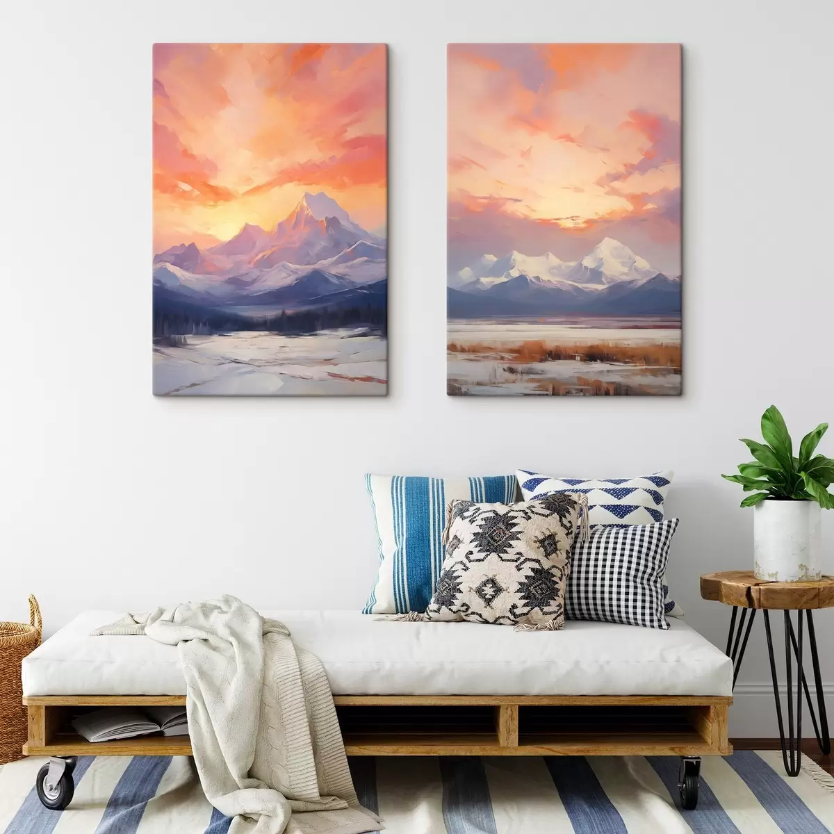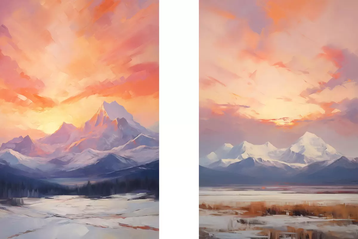 Picture Snow-capped mountains under a vibrant orange and pink sky with clouds Nr m30321