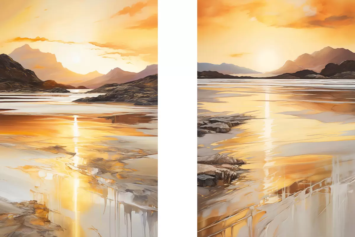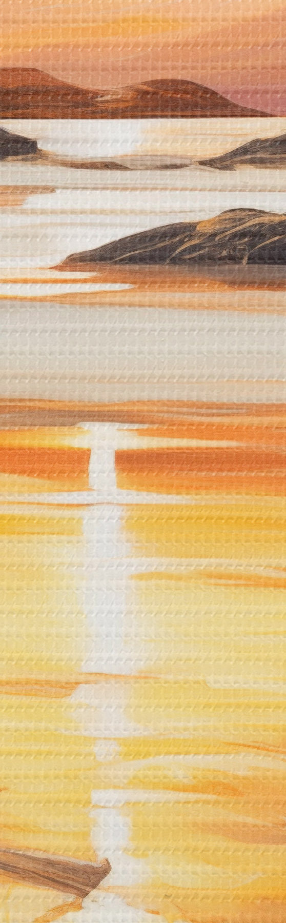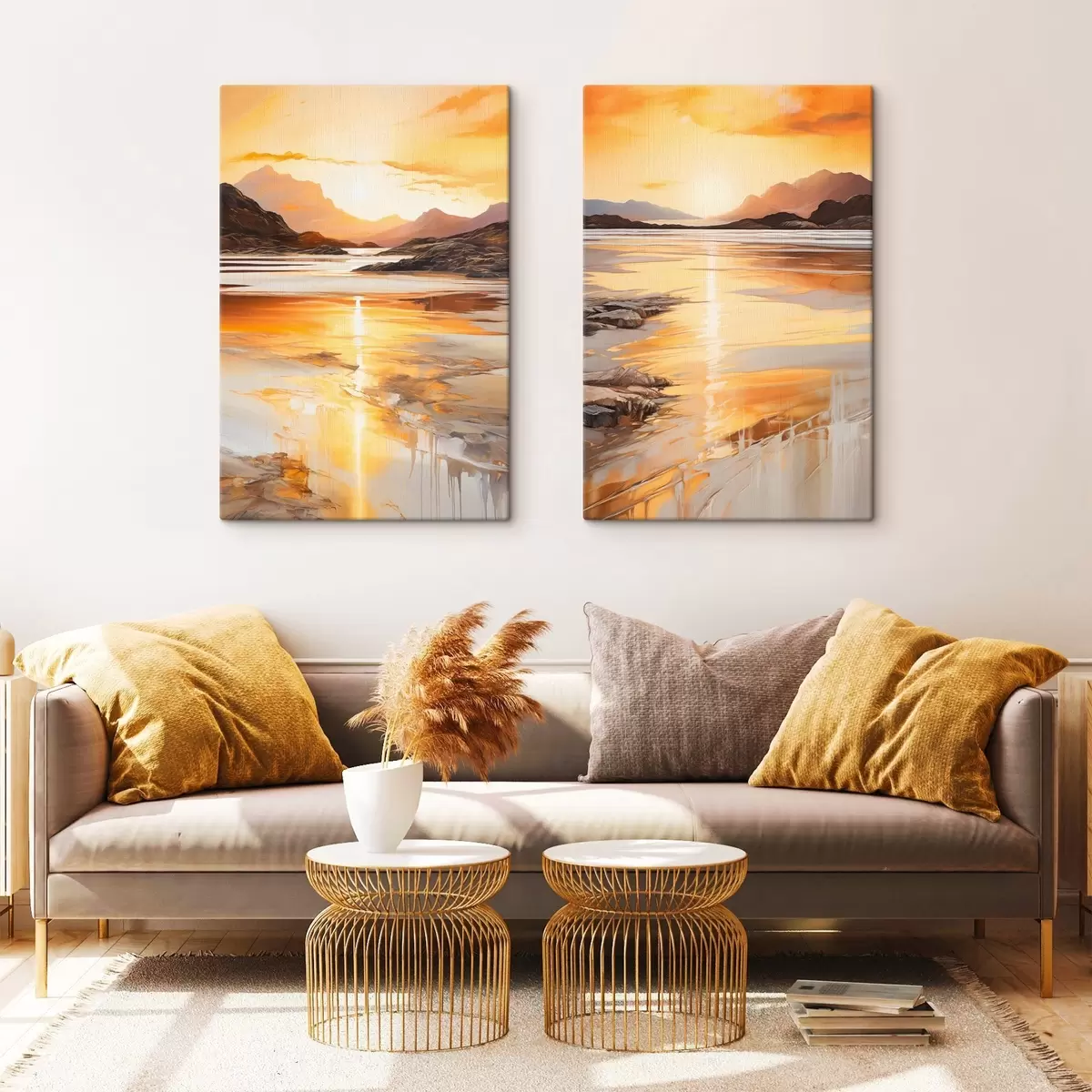 Picture A landscape with a river and mountains under a warm orange sky, sunset Nr m30328