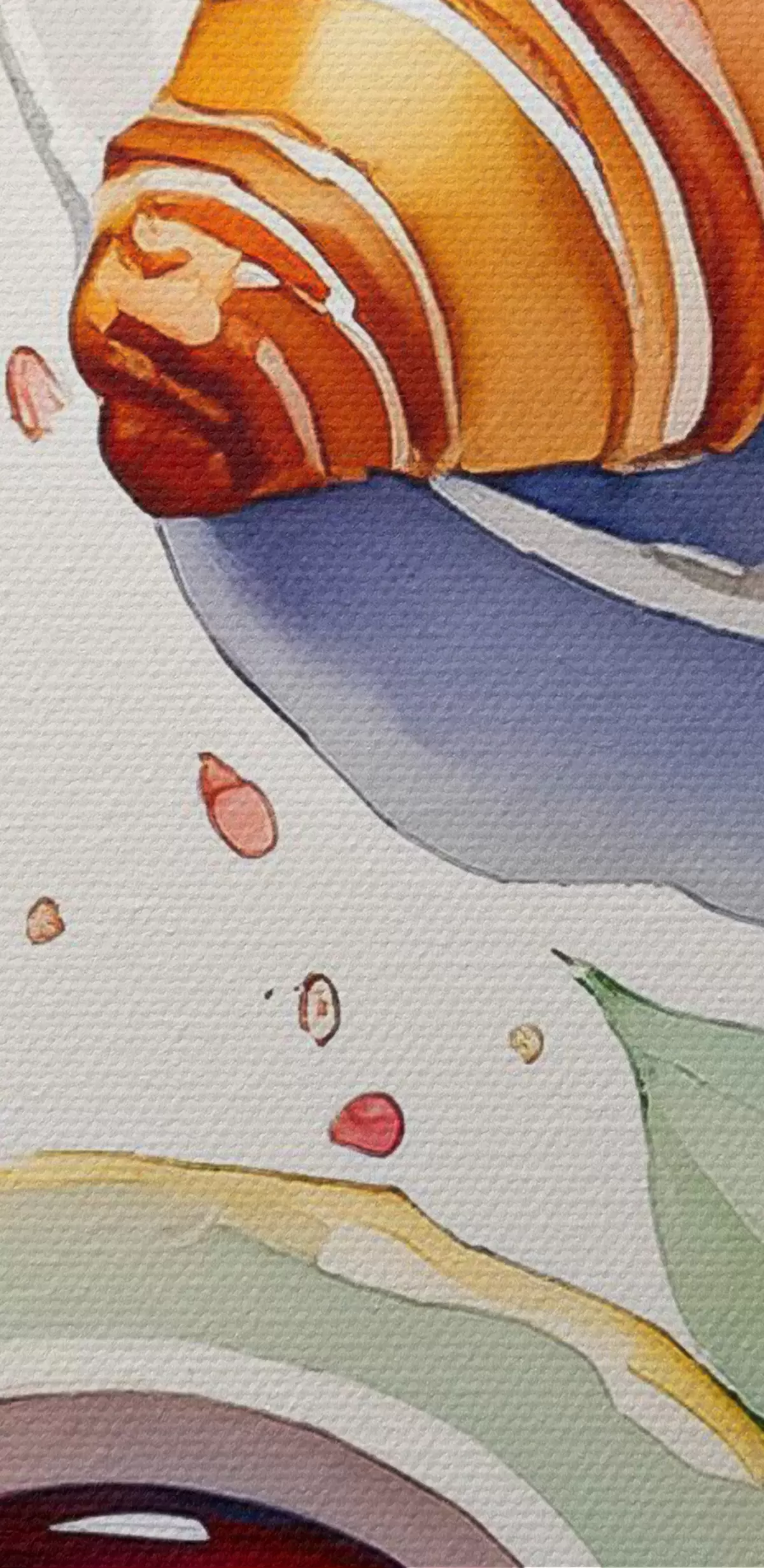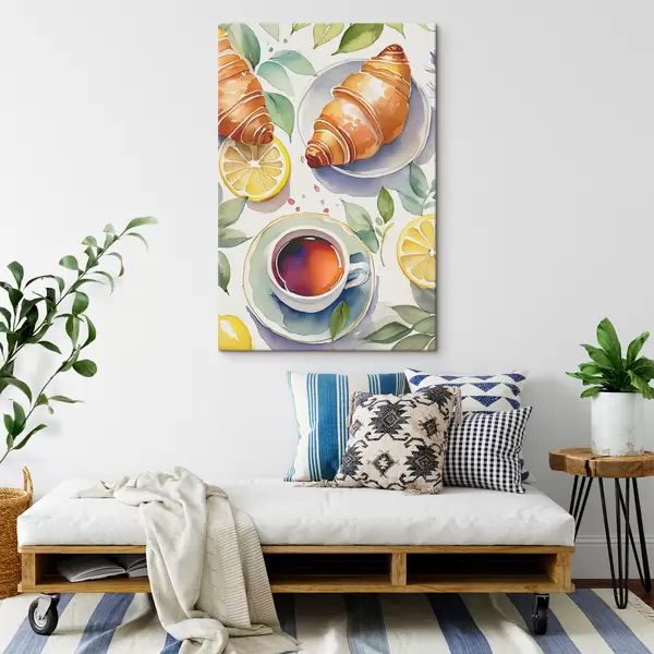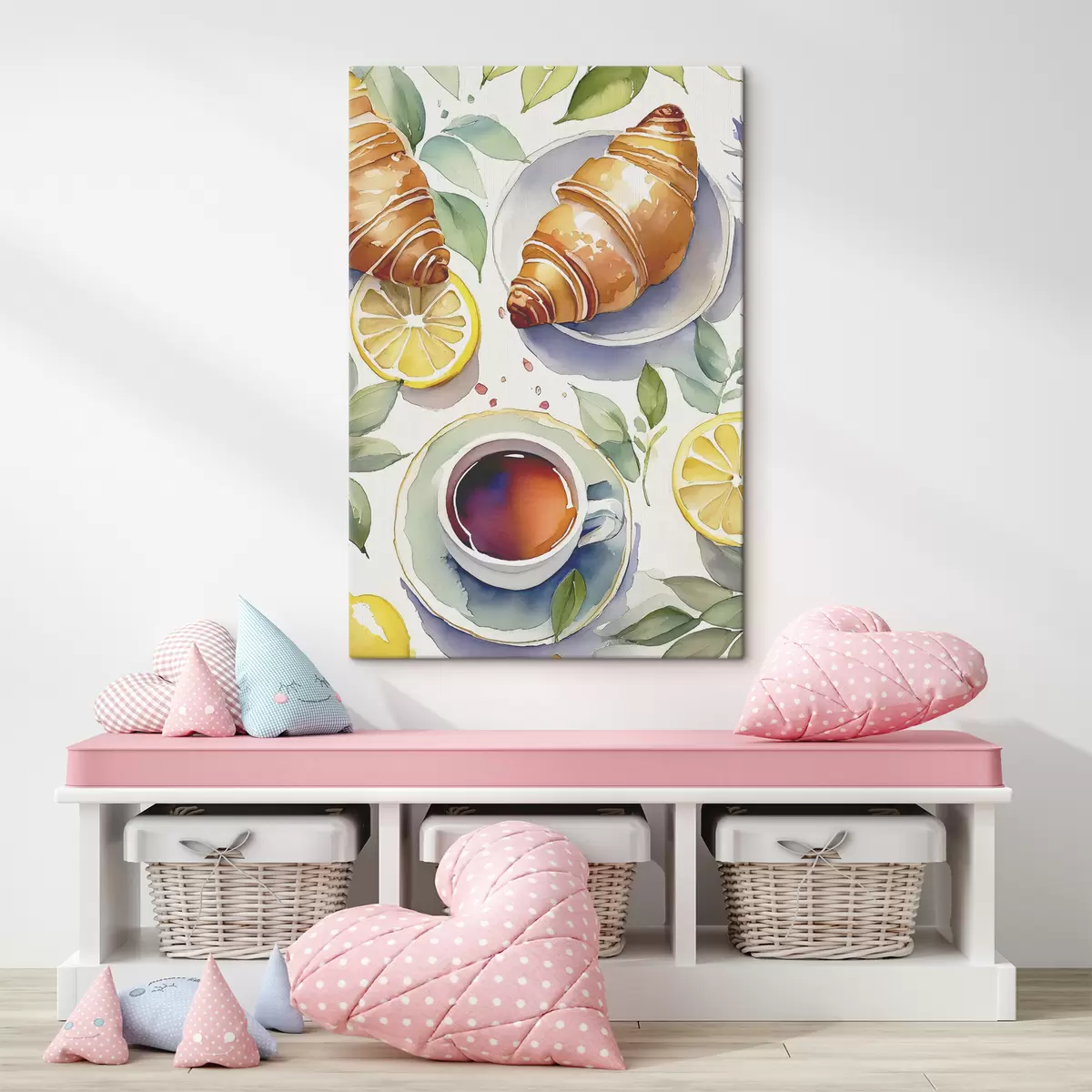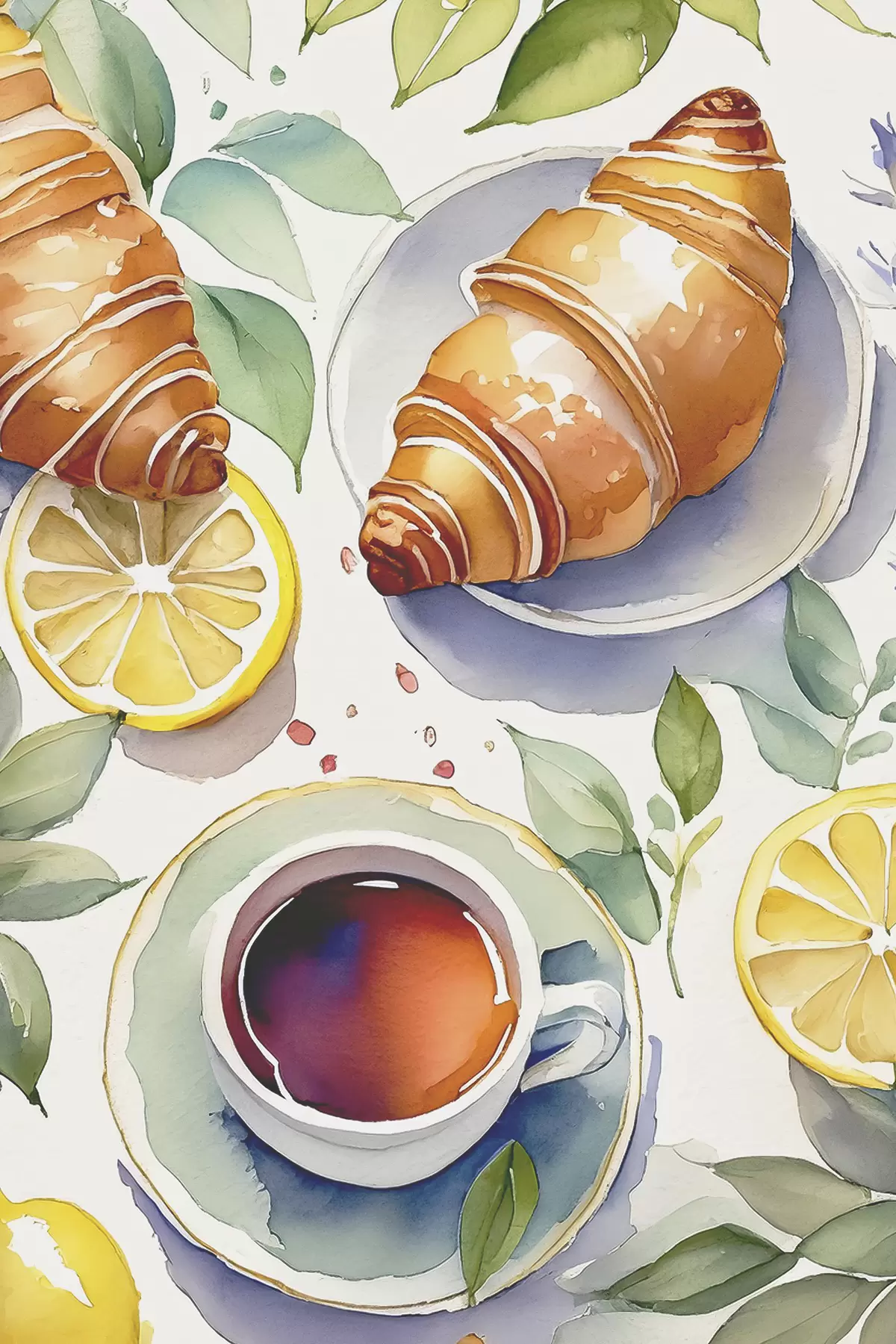 Picture Croissant watercolor, cup of tea, breakfast, lemons, rustic style Nr s38389