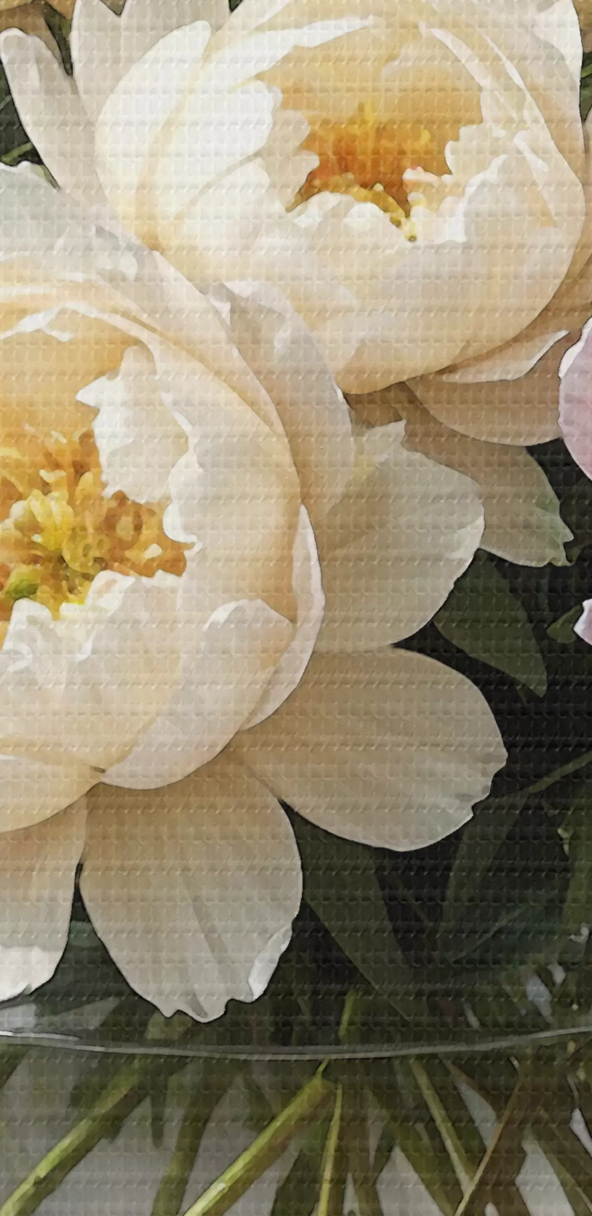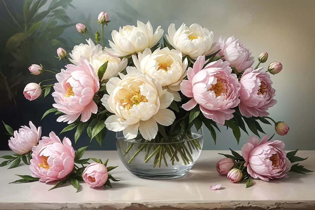 Picture Painting of a bouquet of beautiful white and pink peonies in a glass vase on a wooden table Nr s38967