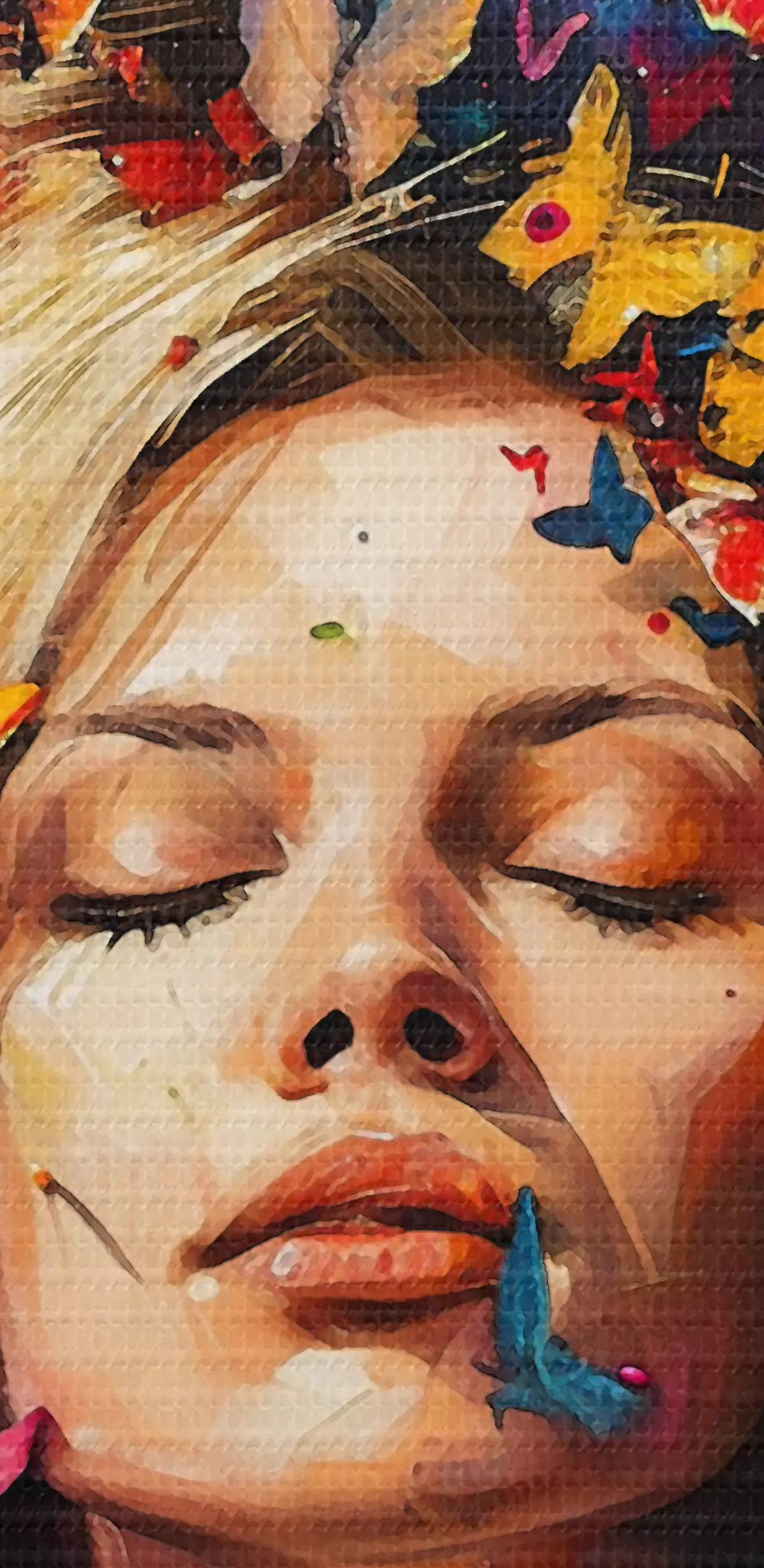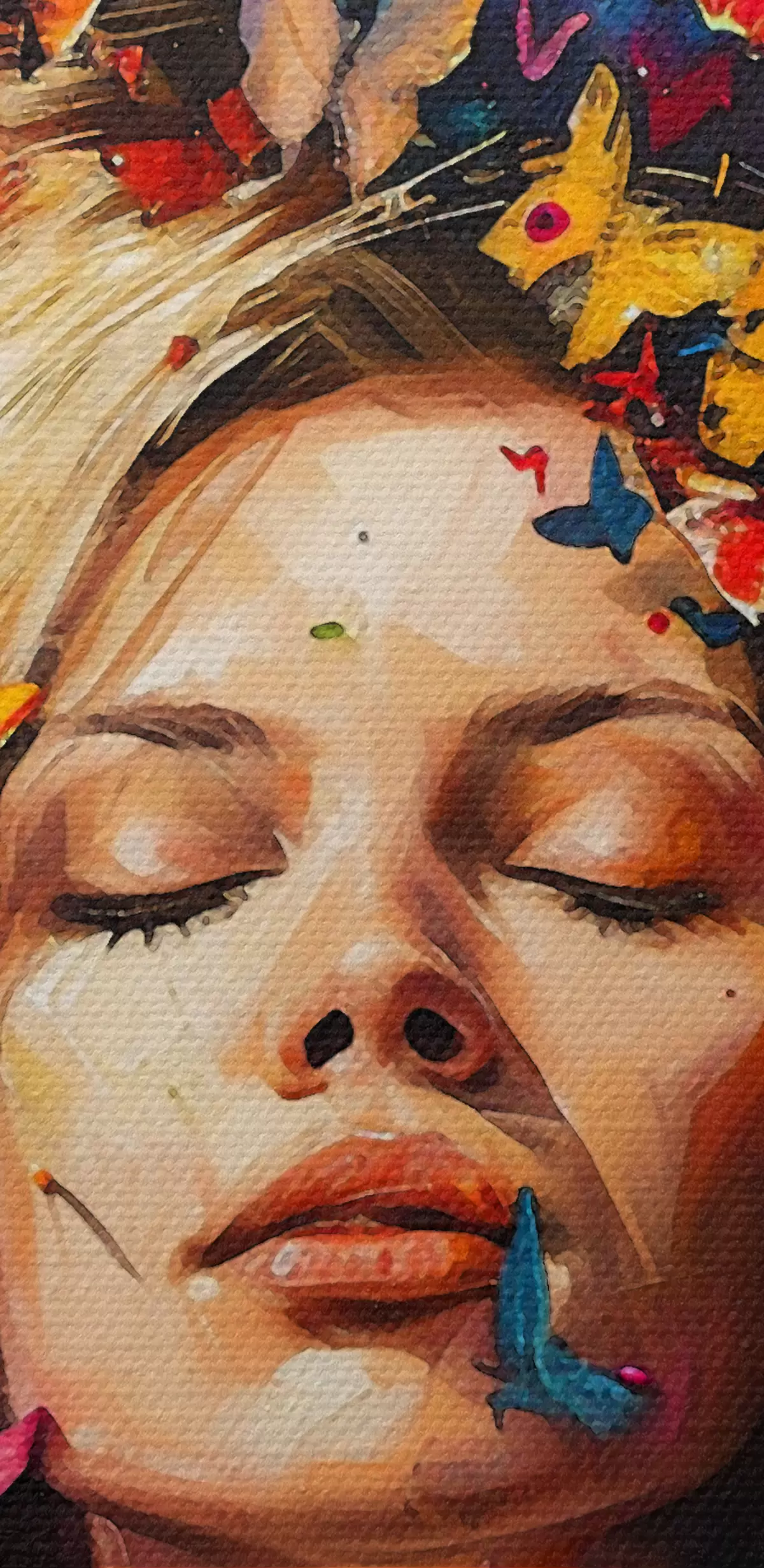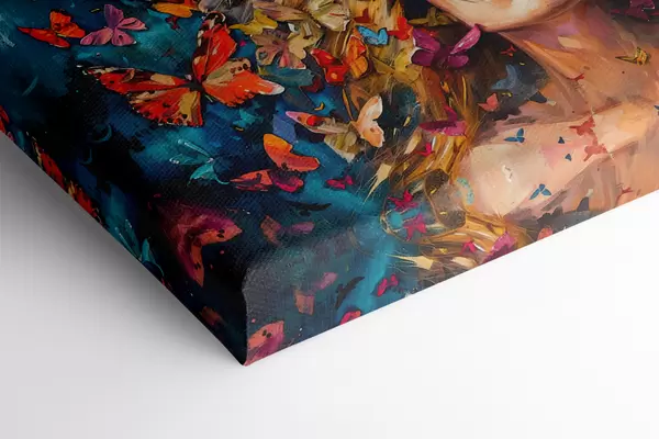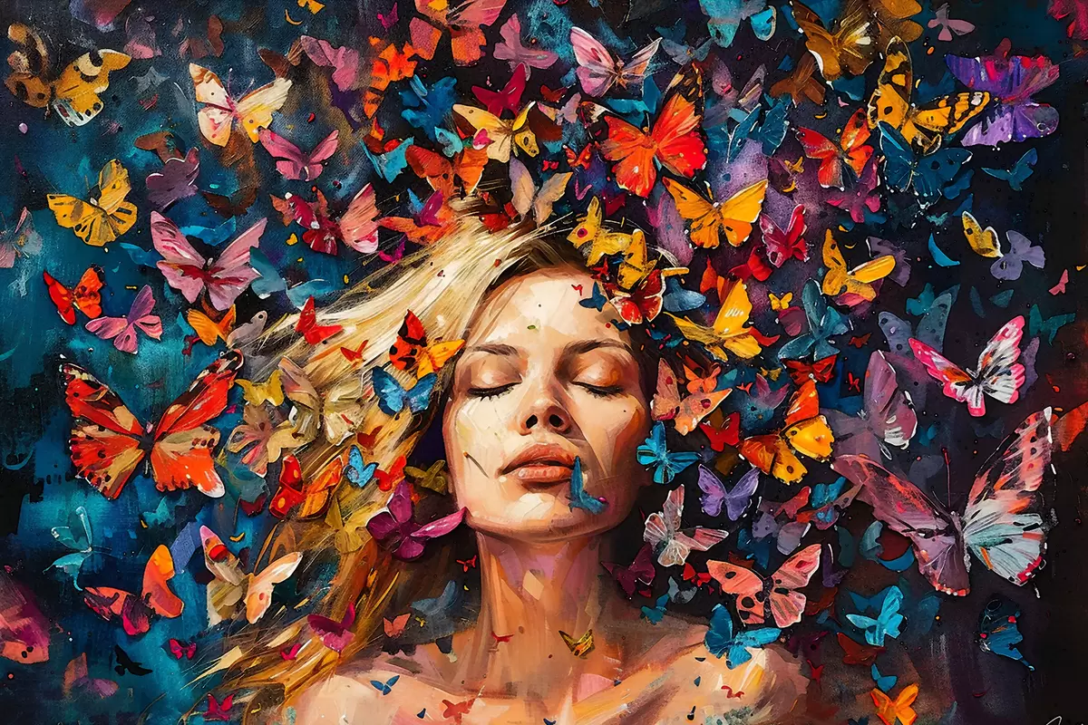Picture Oil painting of a young woman surrounded by a swarm of colorful butterflies against a dark background Nr s38972