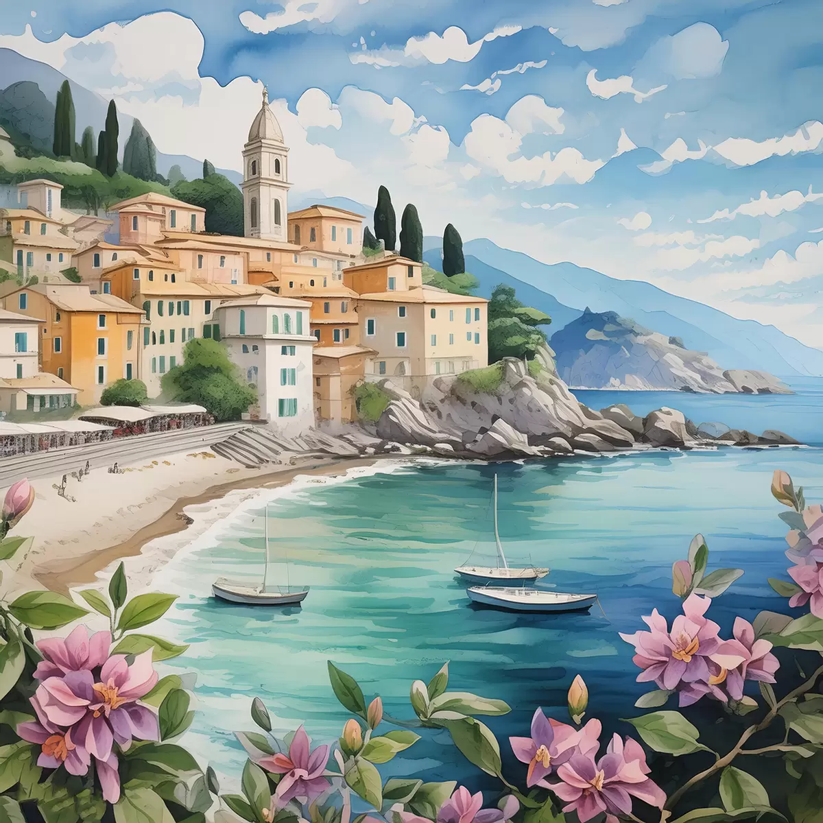 Picture a town by the sea in summer Nr s39299