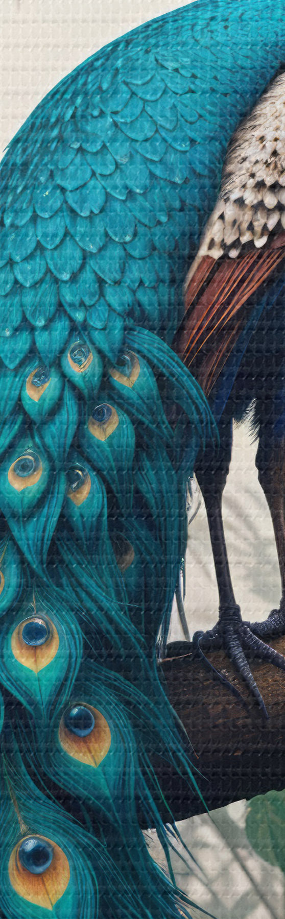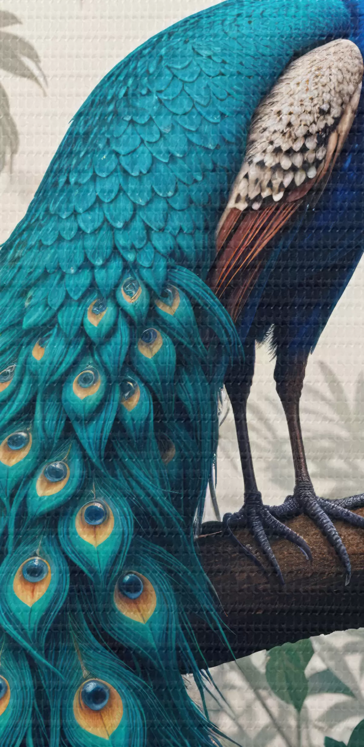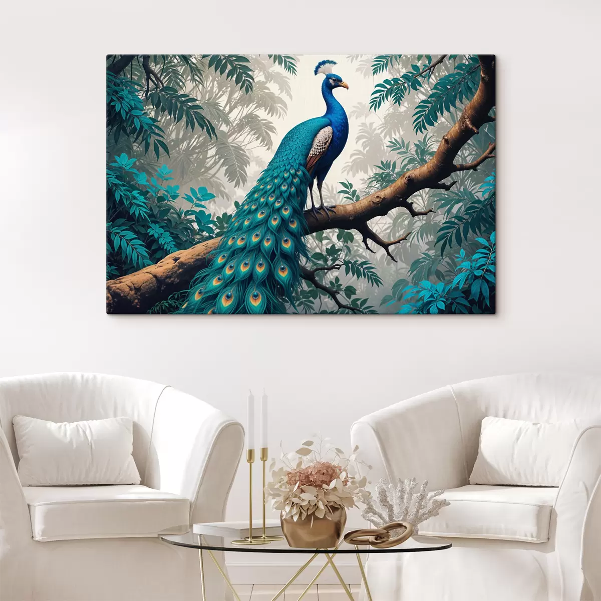 Picture A vibrant blue peacock perched on a tree branch in a lush, tropical forest Nr s39401