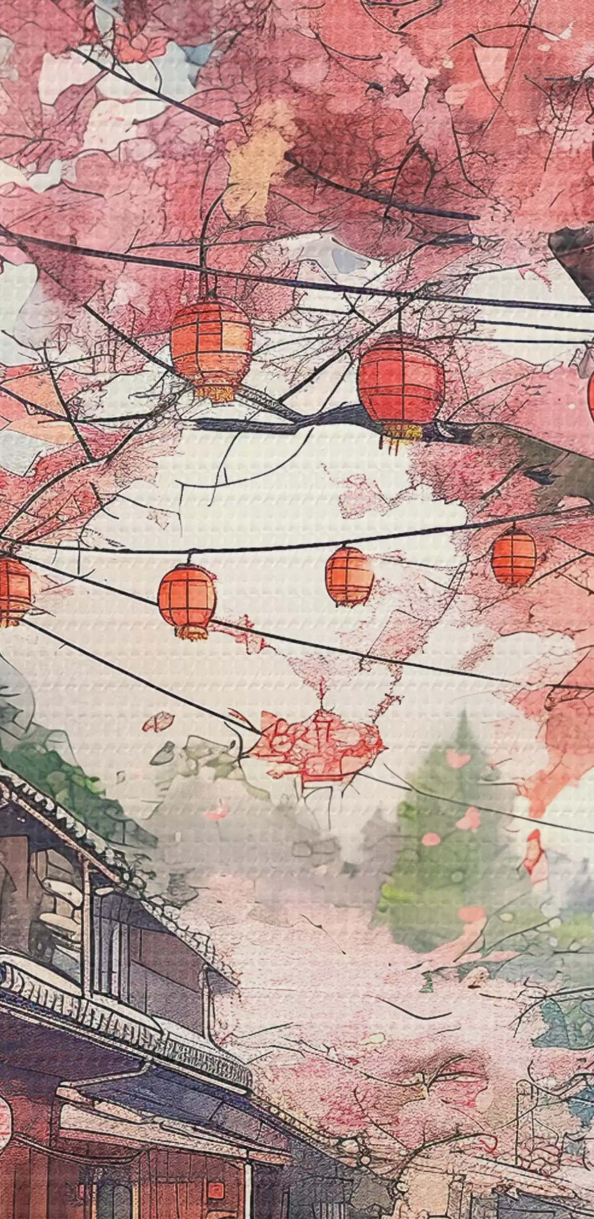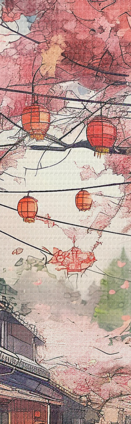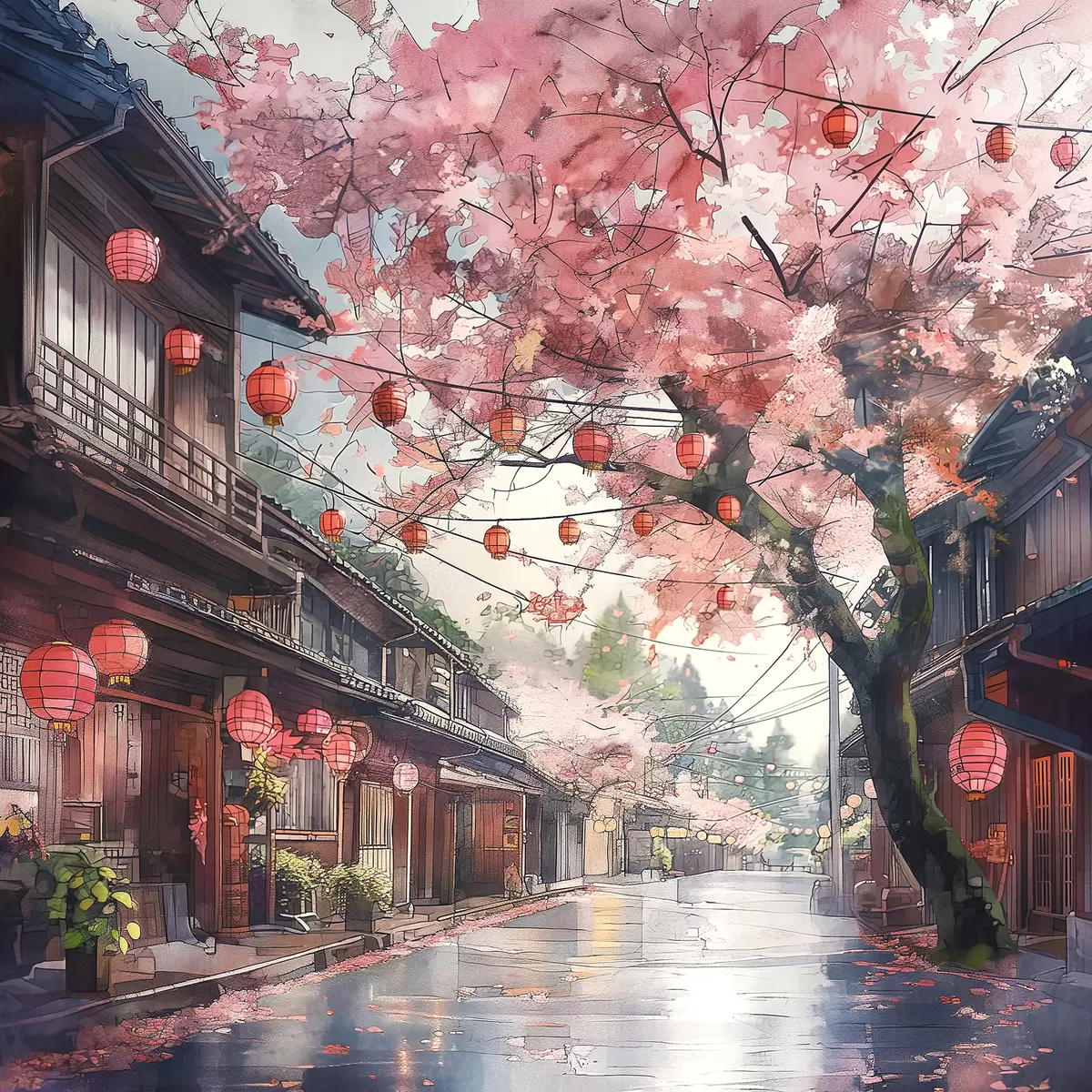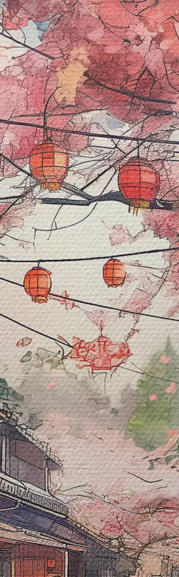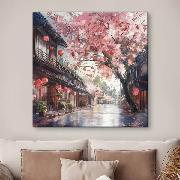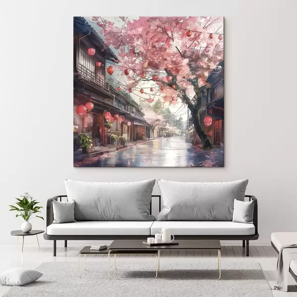 Picture Japanese street with blooming cherry trees, oriental architecture, lanterns Nr s39774