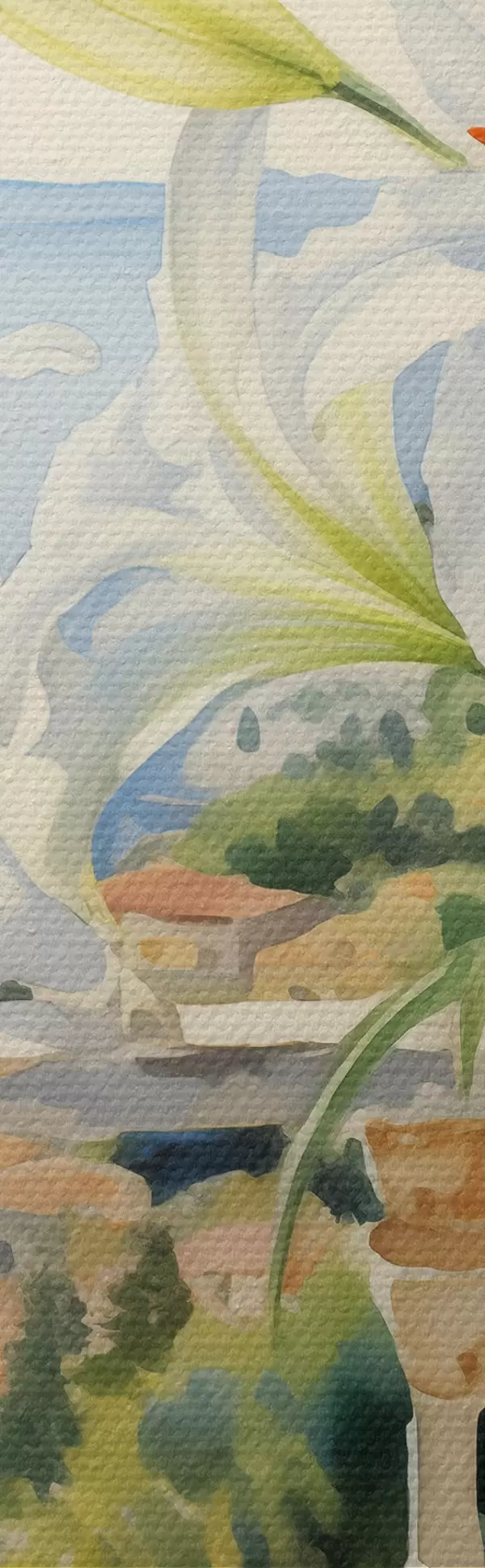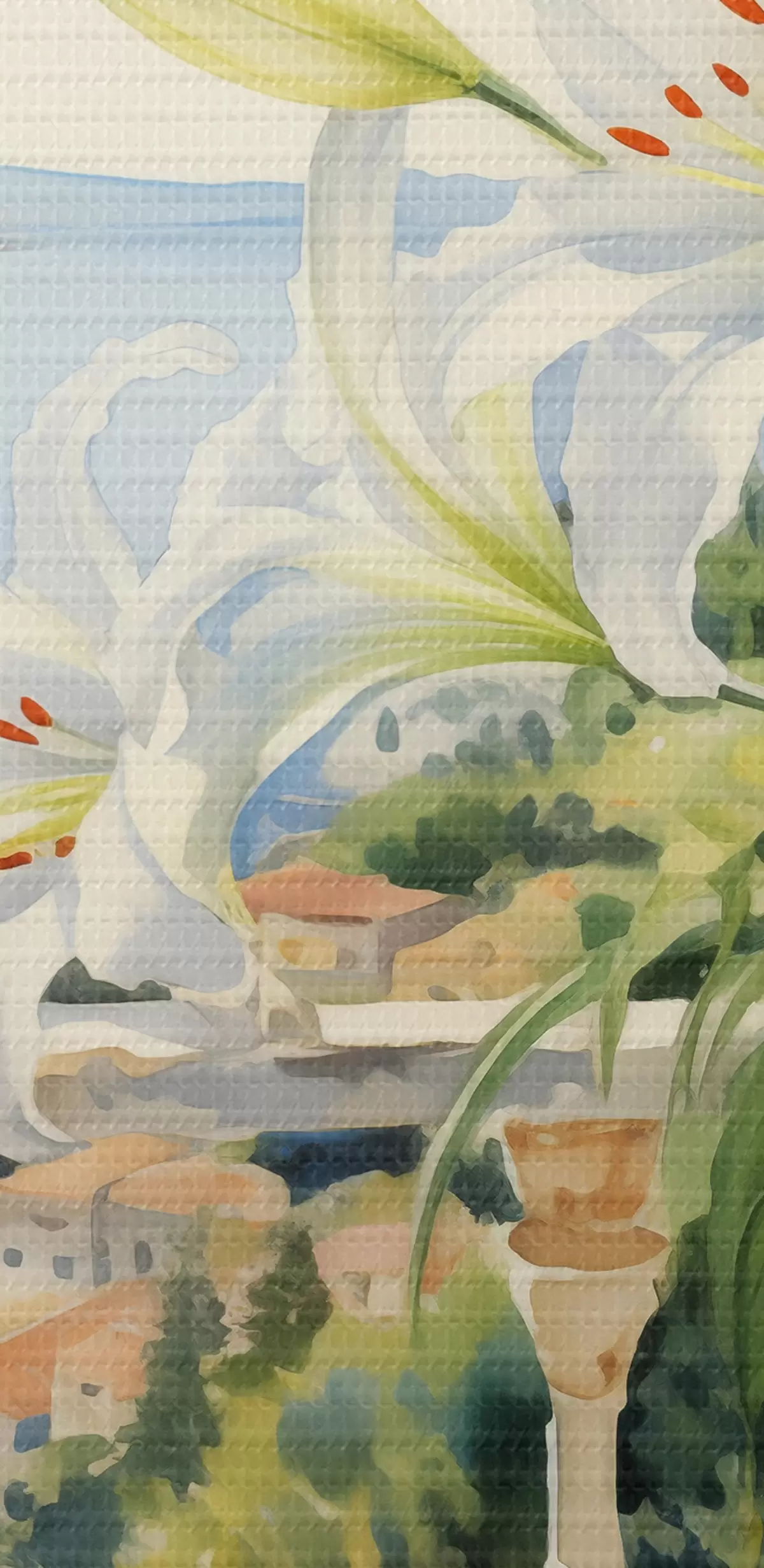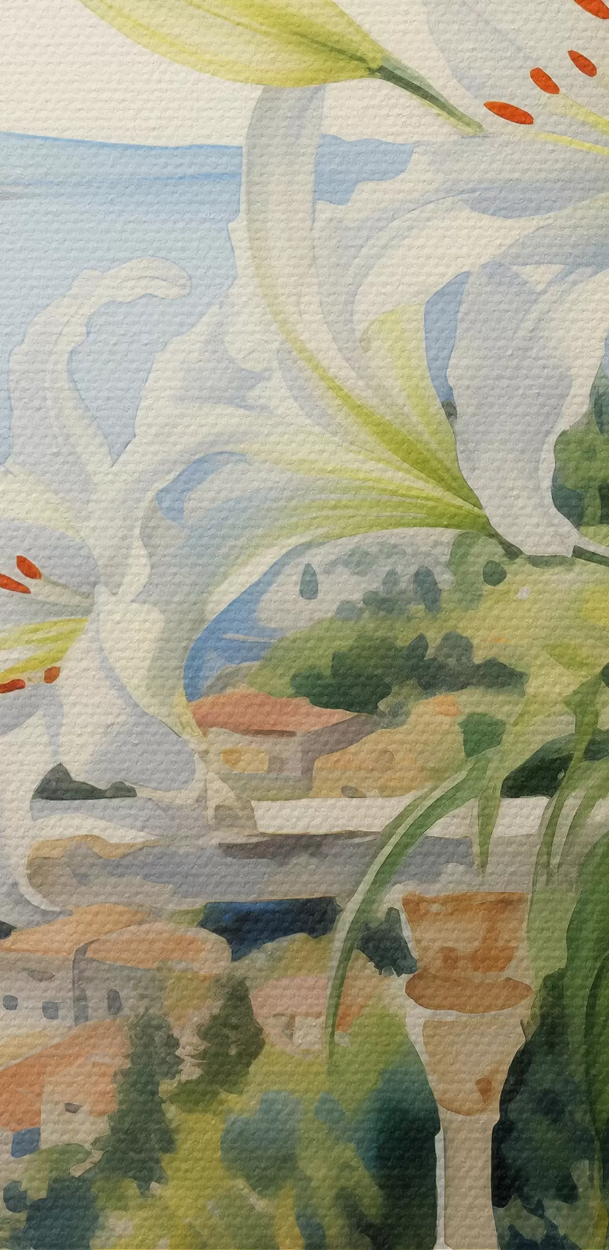 Picture White lilies in a pot on a balcony against the backdrop of the bay watercolor Nr s39932