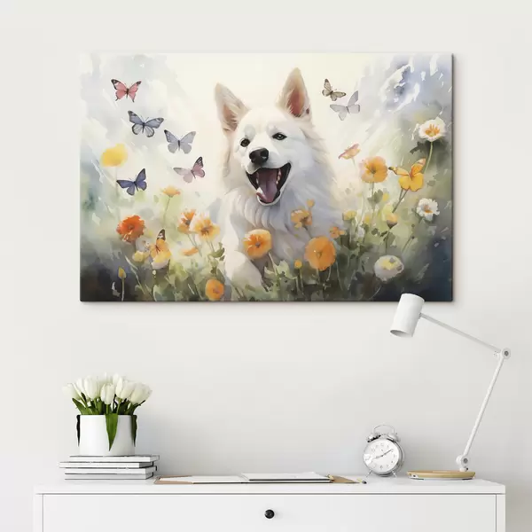 Picture White dog sits in flowers, butterflies fly watercolor Nr s39936