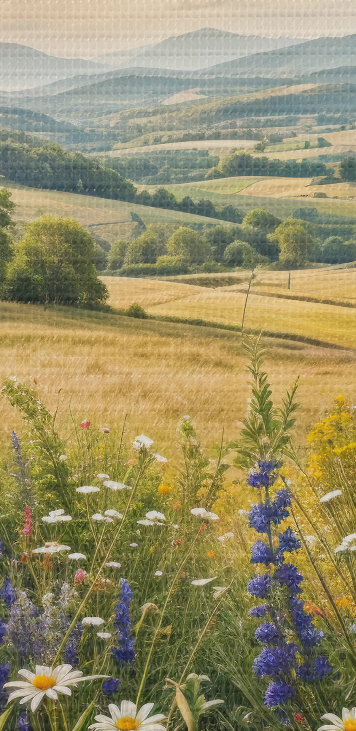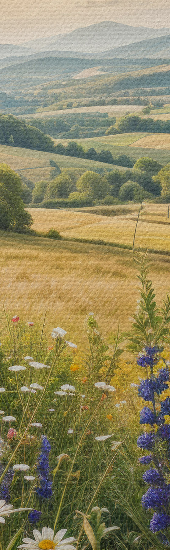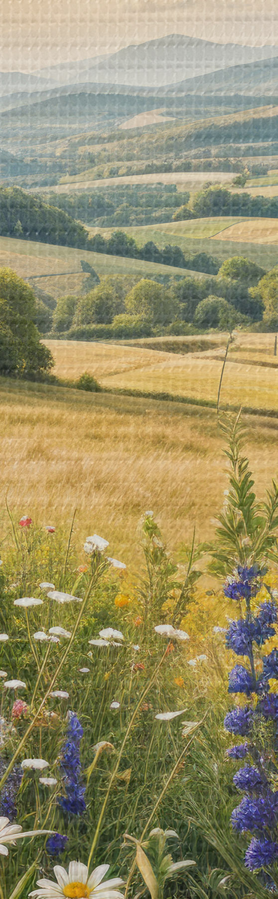Picture A lush countryside landscape with a vibrant wildflower meadow filled with colorful flowers under a cloudy sky Nr s40018