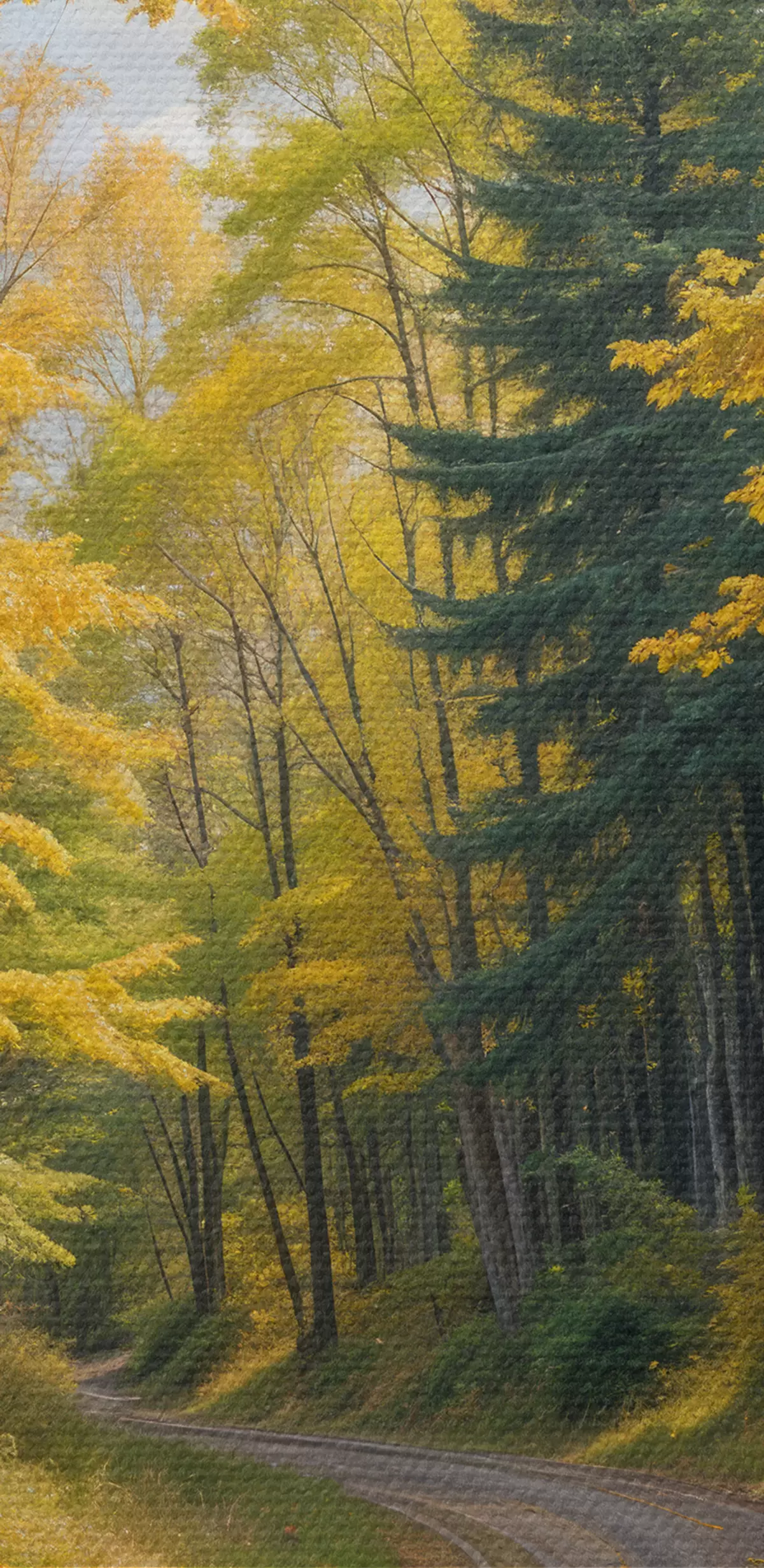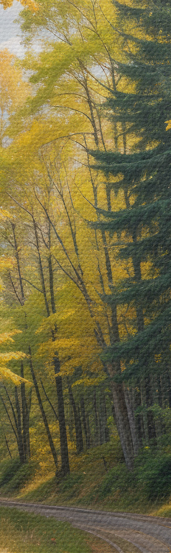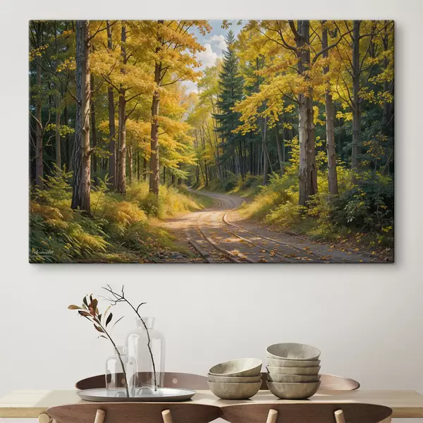 Picture A dirt road winding through a forest in autumn, with tall trees on both sides Nr s40031
