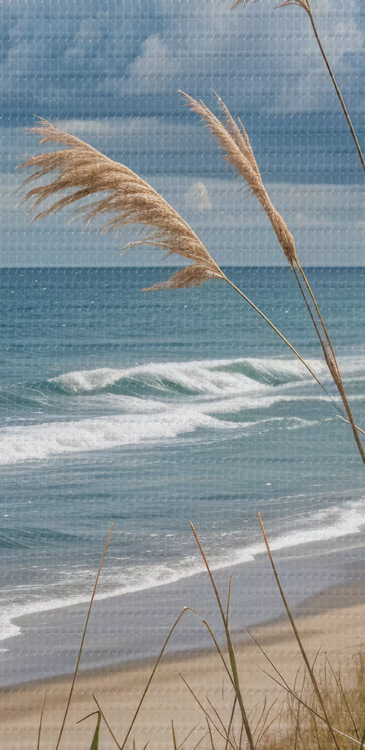 Picture A scenic beach with tall grass swaying in the wind, overlooking the ocean with crashing waves and a cloudy sky Nr s40161