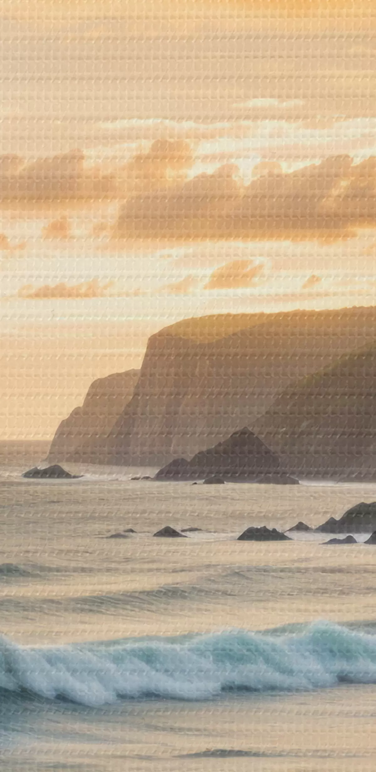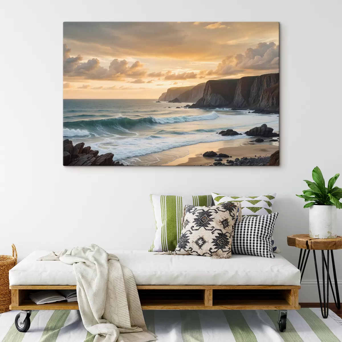 Picture A scenic coastal landscape with dramatic cliffs, crashing waves, and a colorful sunset sky Nr s40176