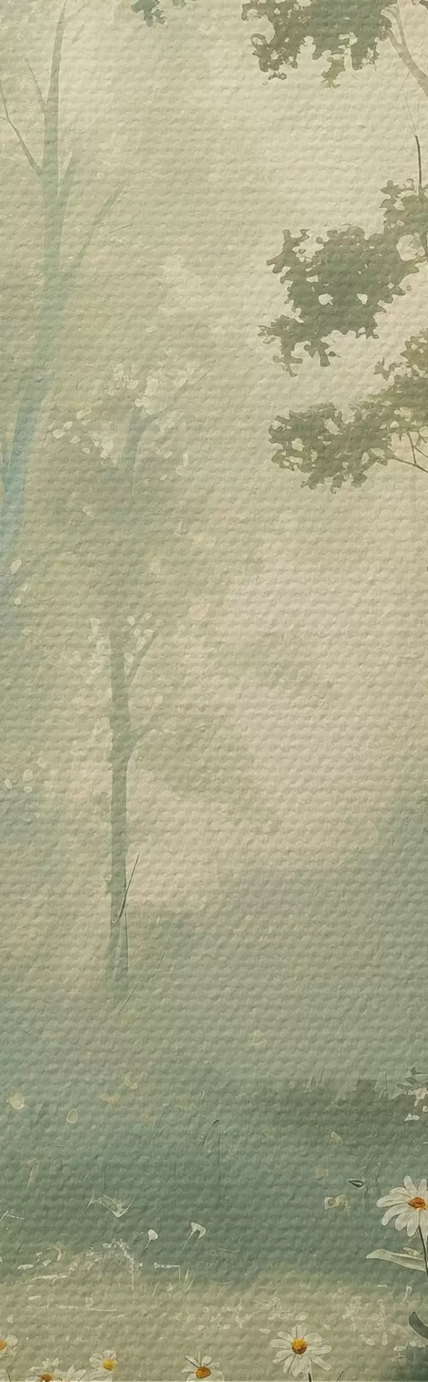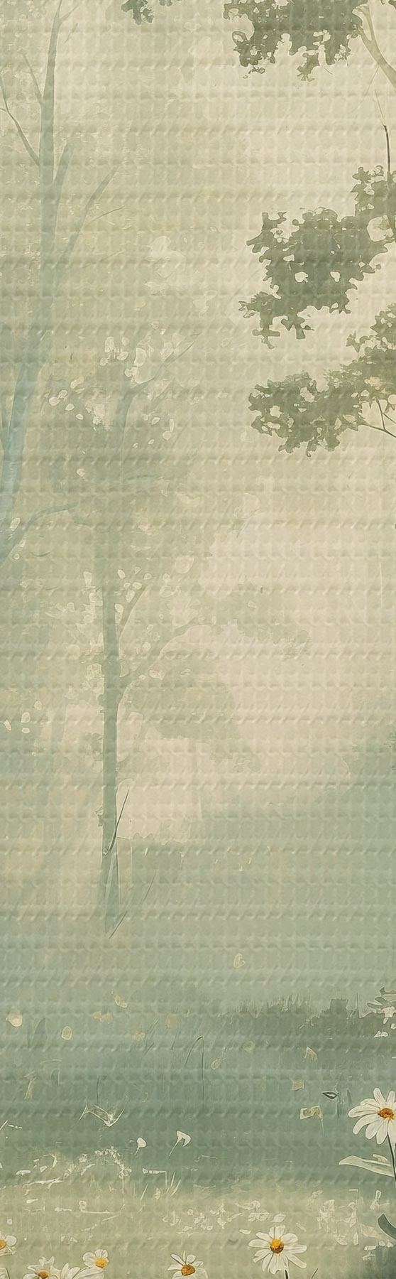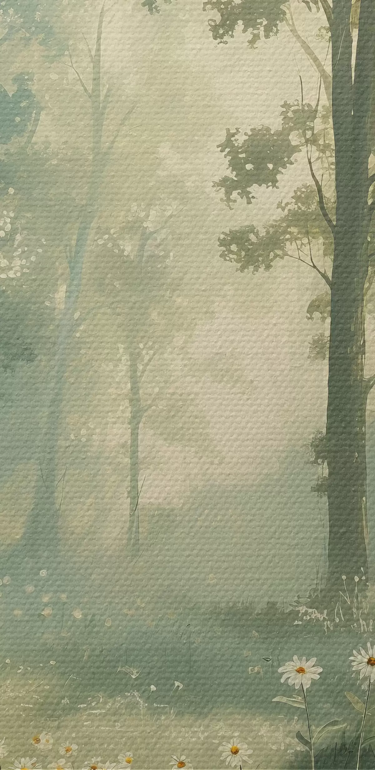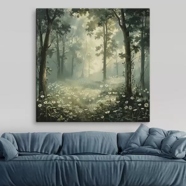 Picture Forest with soft sunlight, camomile flowers, trees, green grass, acrylic drawing Nr s40228