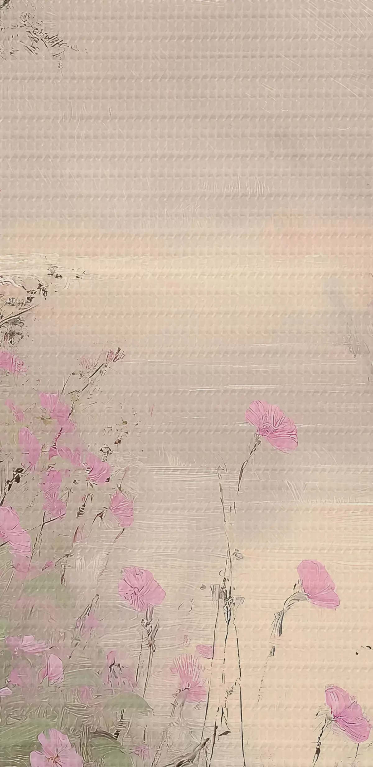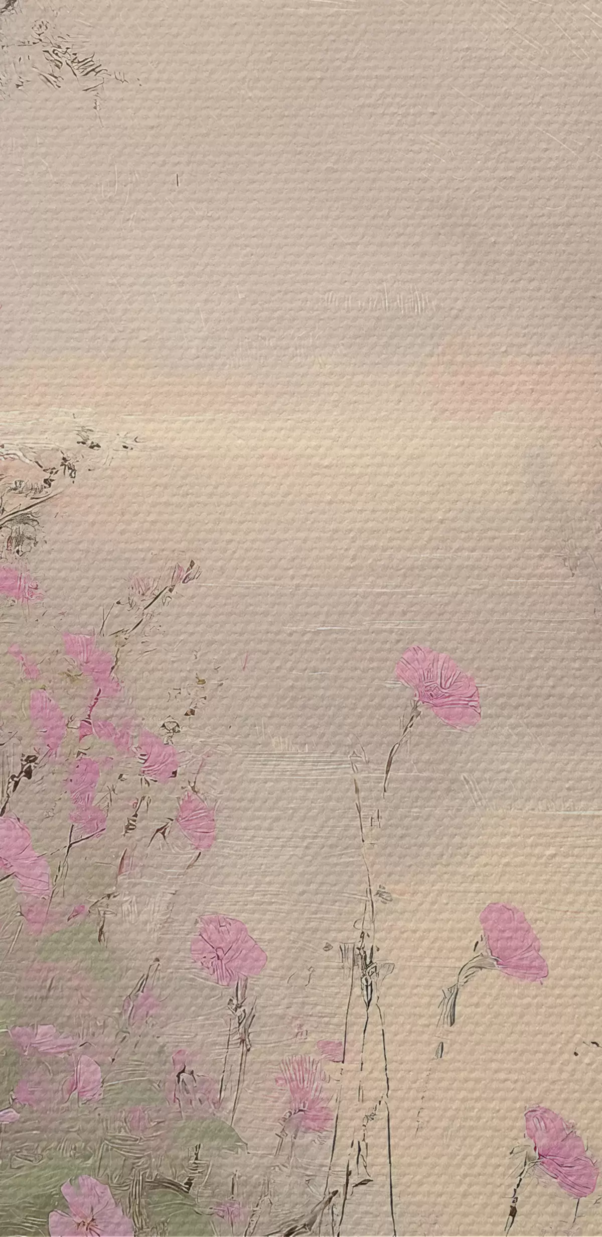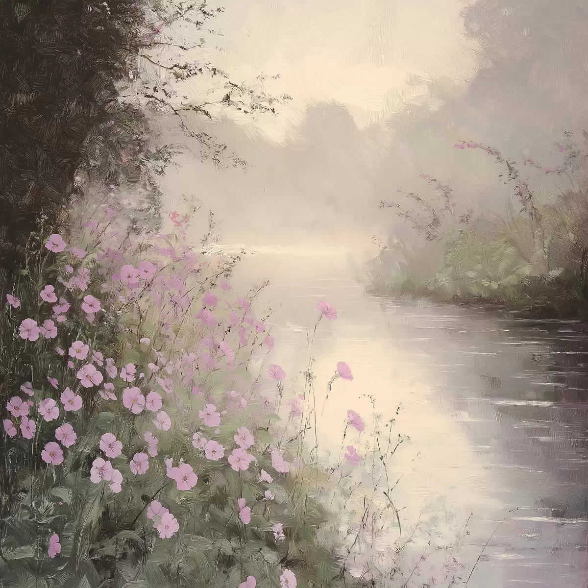 Picture Lake with pink flowers, sunrise, oil drawing, pastel beige colors, mist Nr s40229