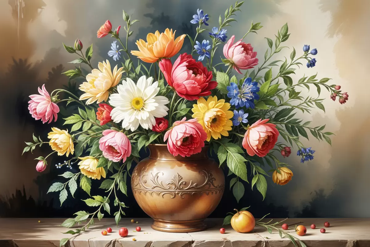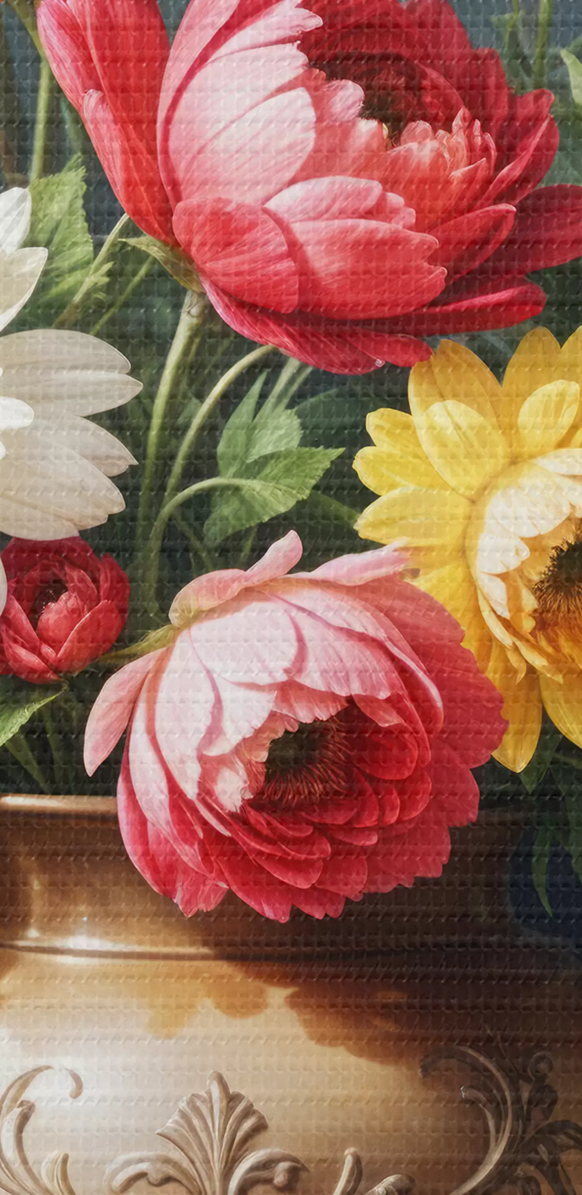 Picture A vibrant painting of a bouquet of colorful flowers including red roses, yellow daffodils, and white daisies Nr s40395