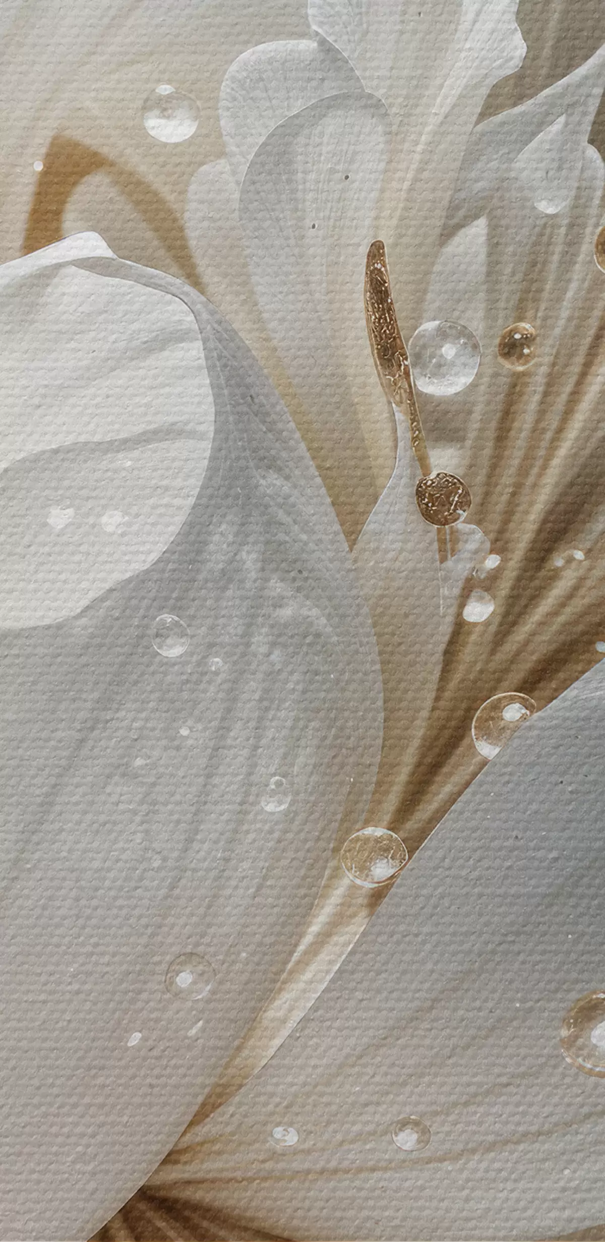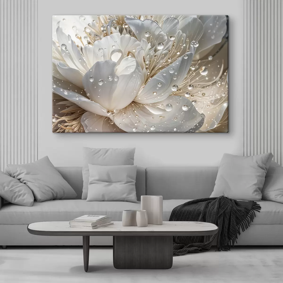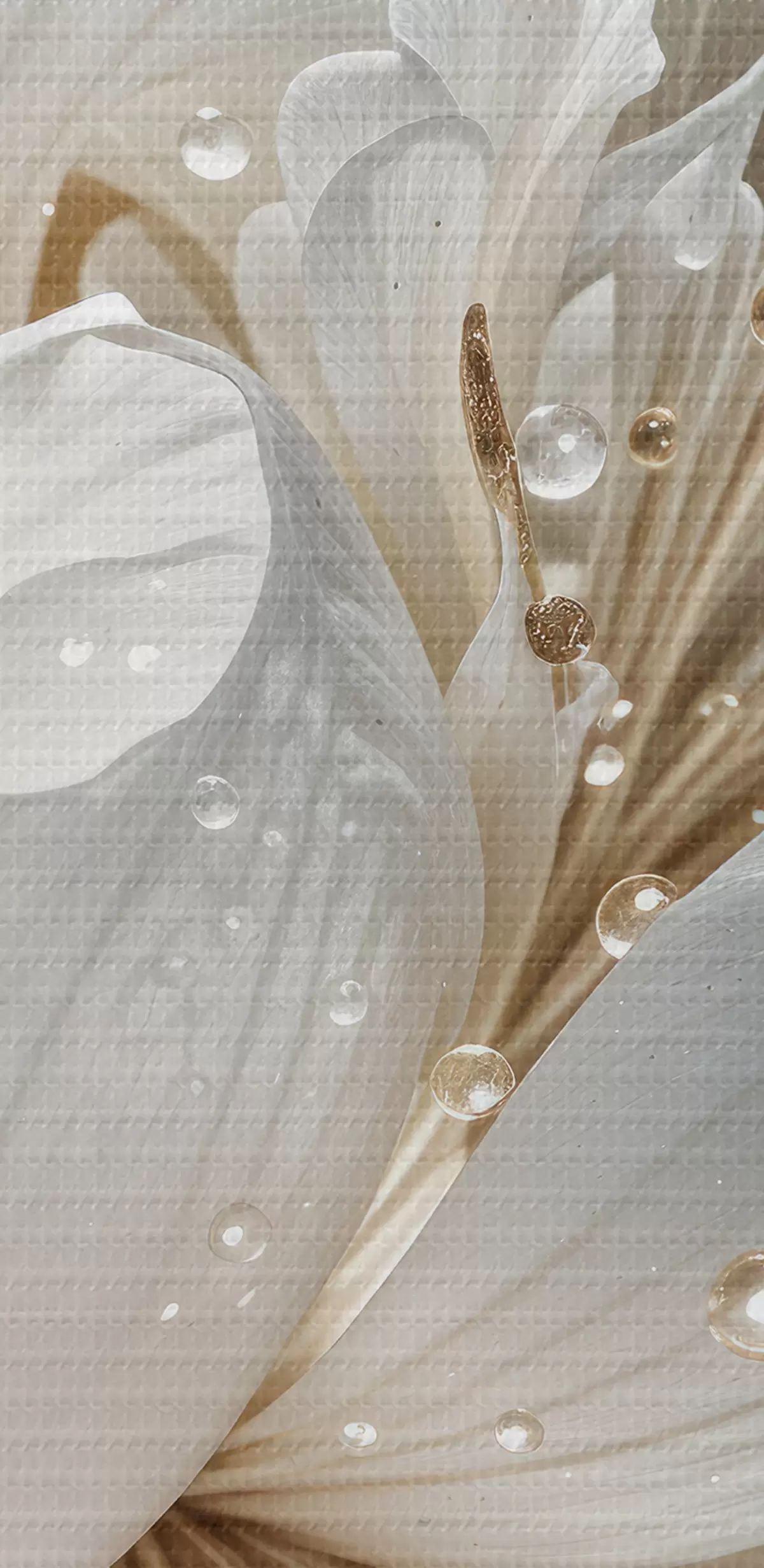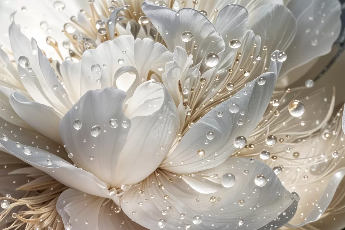 Picture A close-up of a white peony flower with water droplets on the petals, against a blurred background Nr s40539