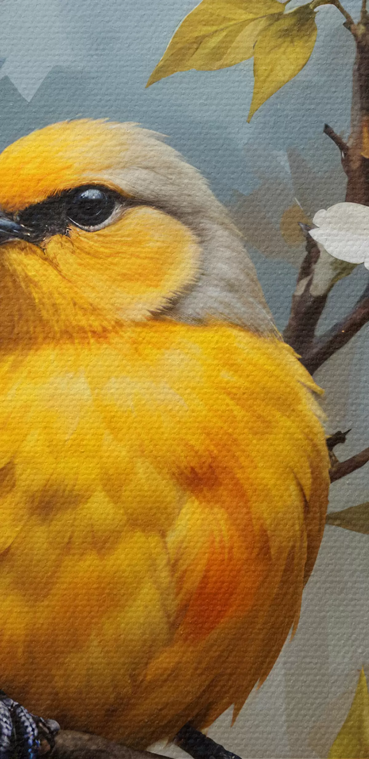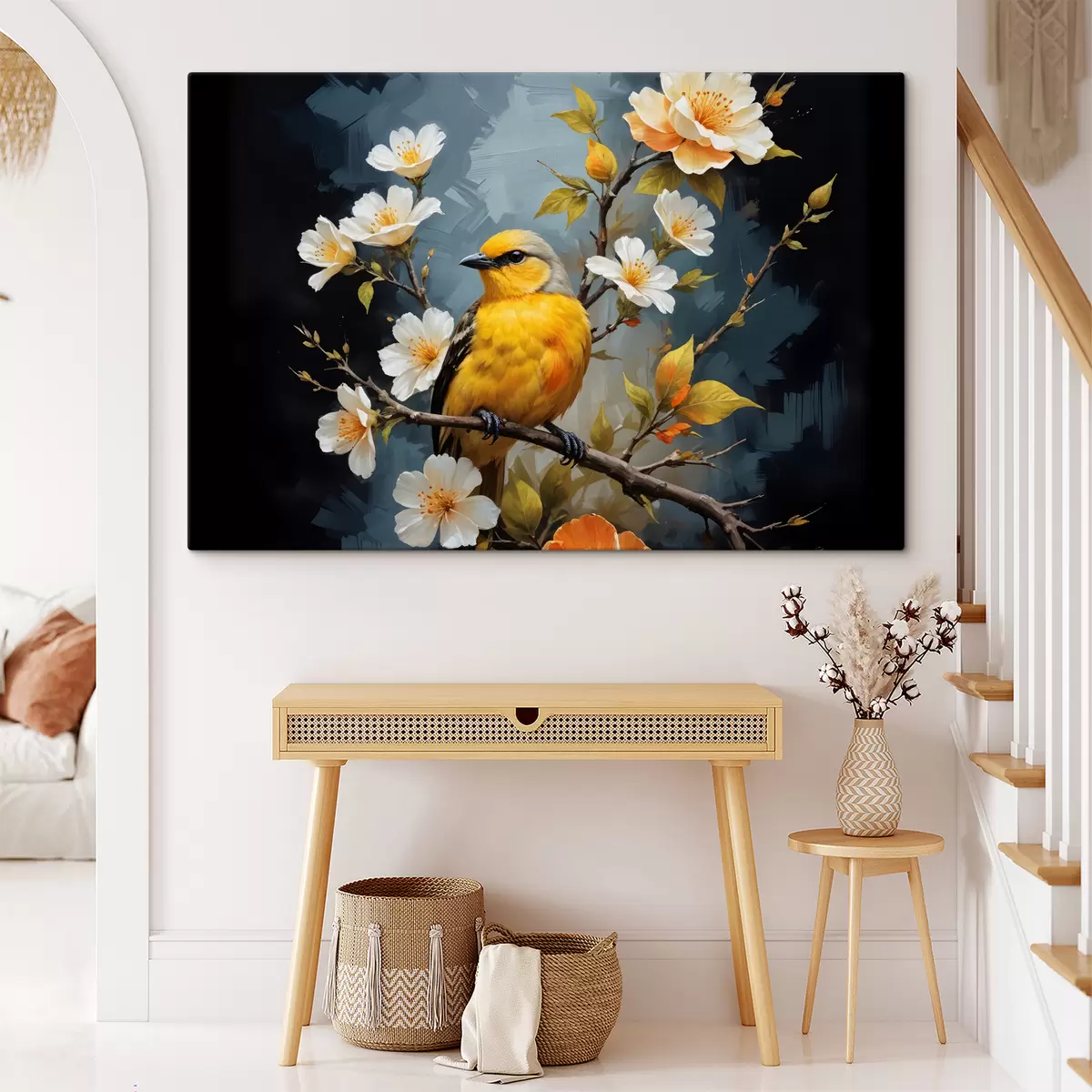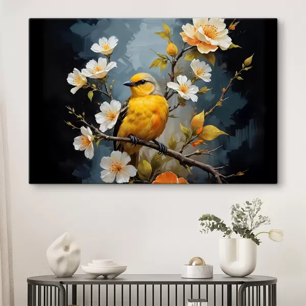 Picture A yellow bird perched on a branch with white and orange flowers in the background Nr s40550