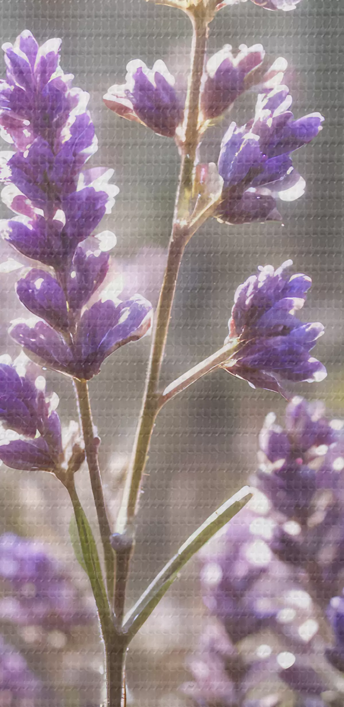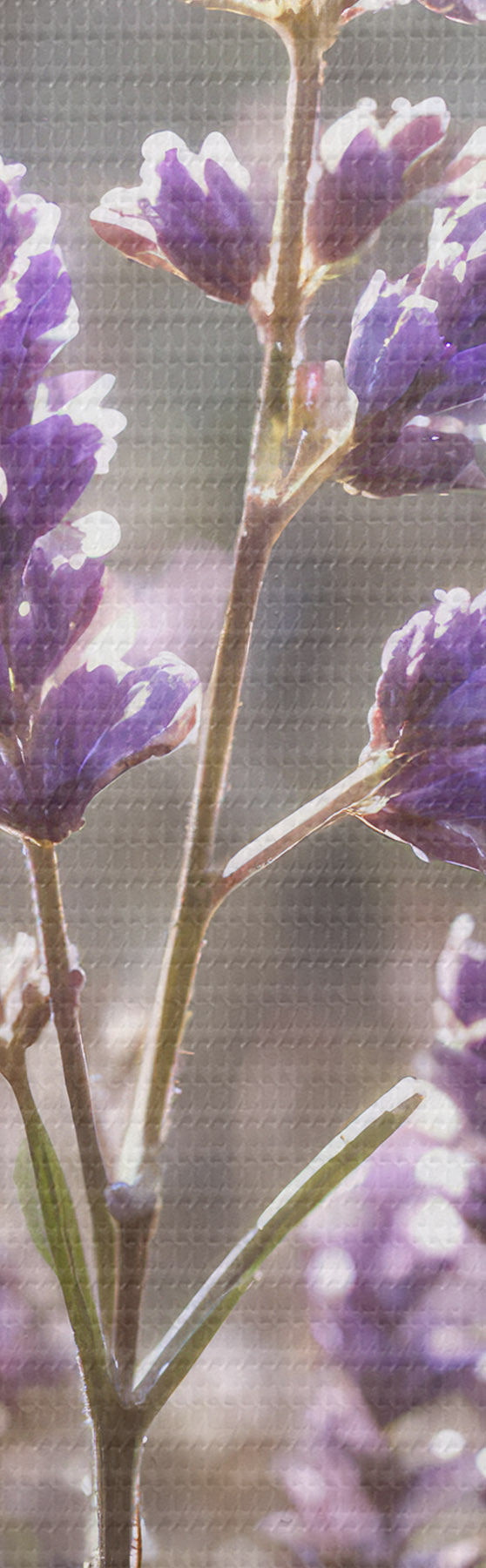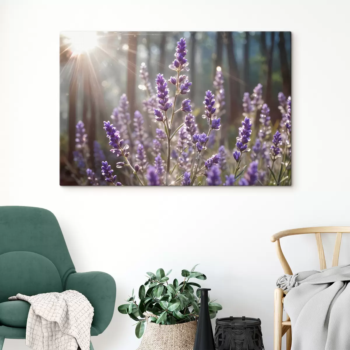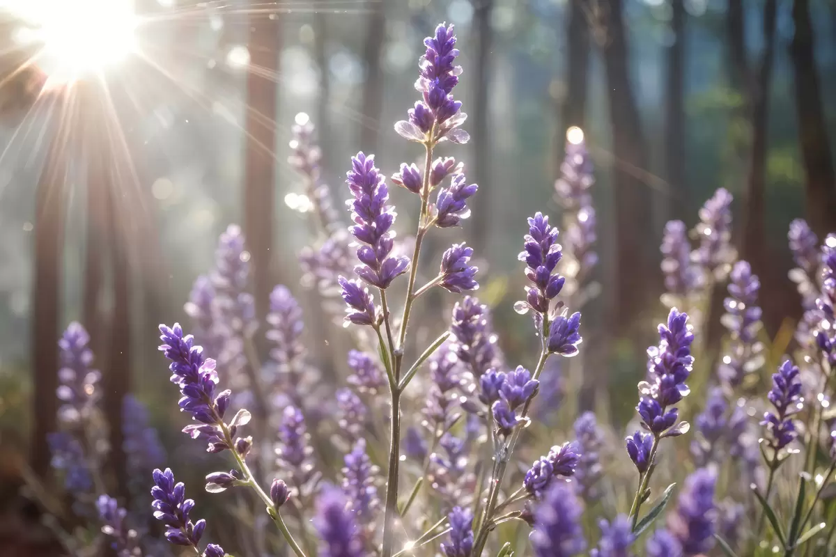 Picture Purple lavender flowers in a field, with a blurred forest background and sunlight filtering through Nr s40570