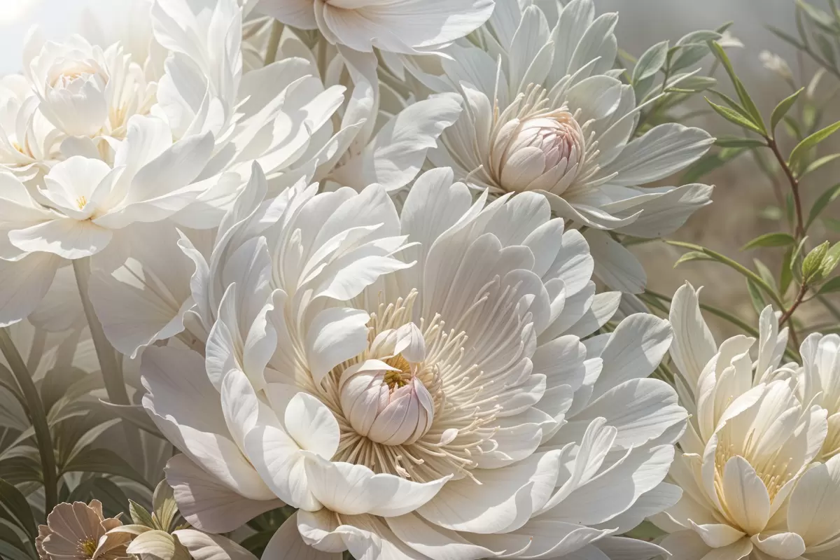 Picture A close-up of several large, white peony flowers with soft, delicate petals and pale yellow centers Nr s40575