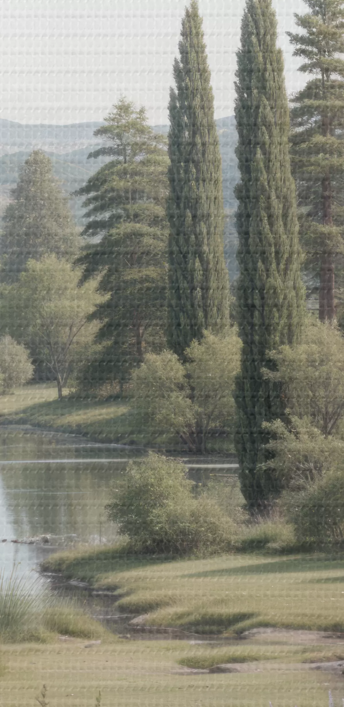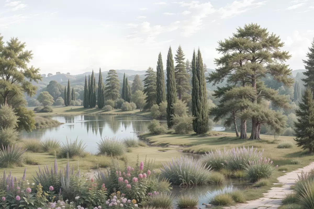 Picture A serene landscape with a tranquil lake surrounded by pine trees, cypress trees, and other lush vegetation Nr s40579