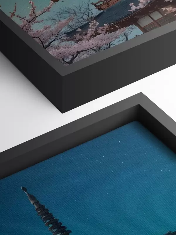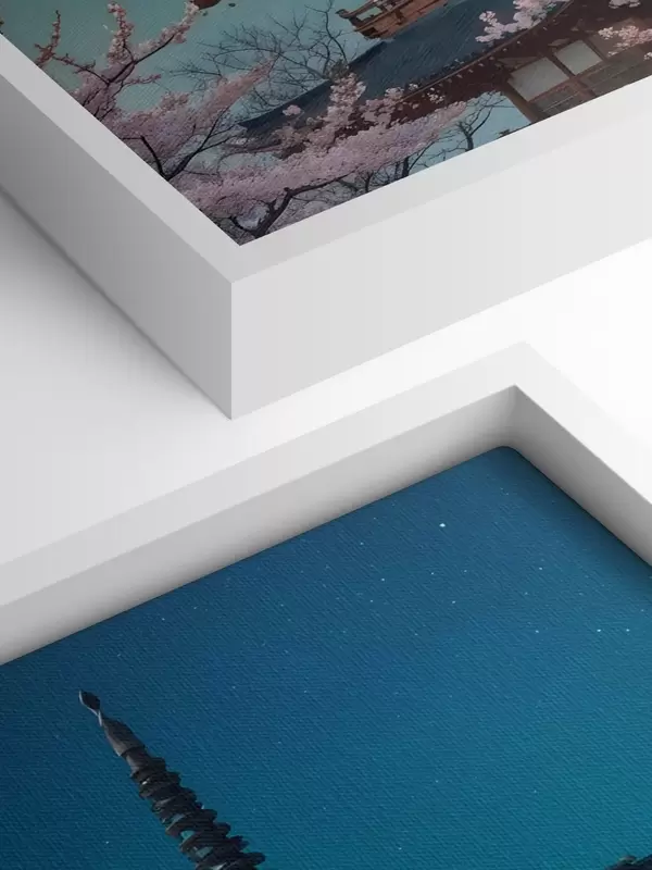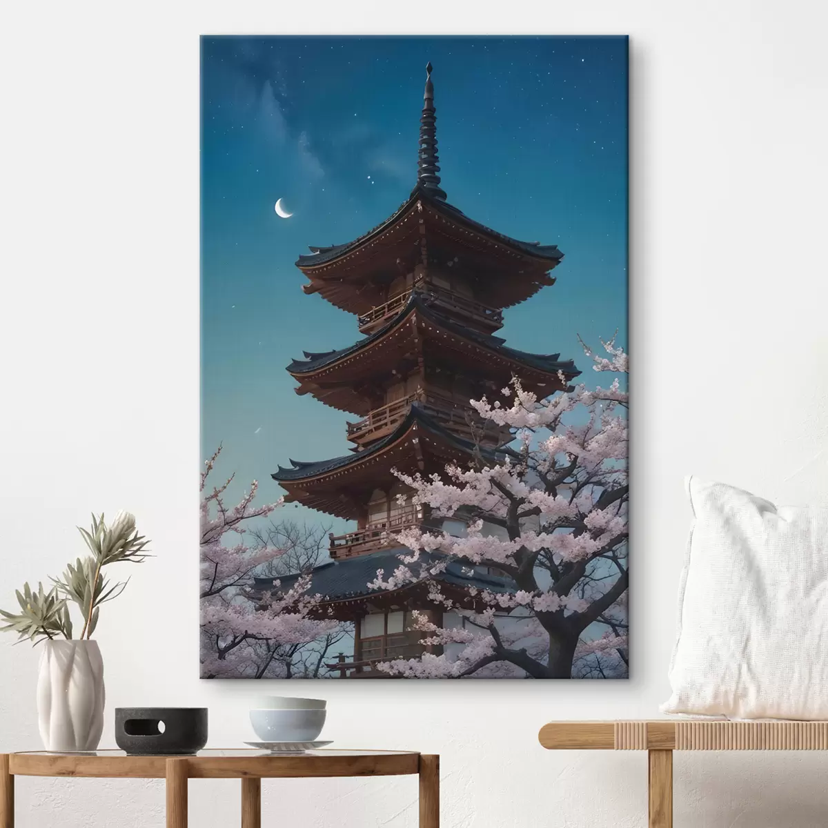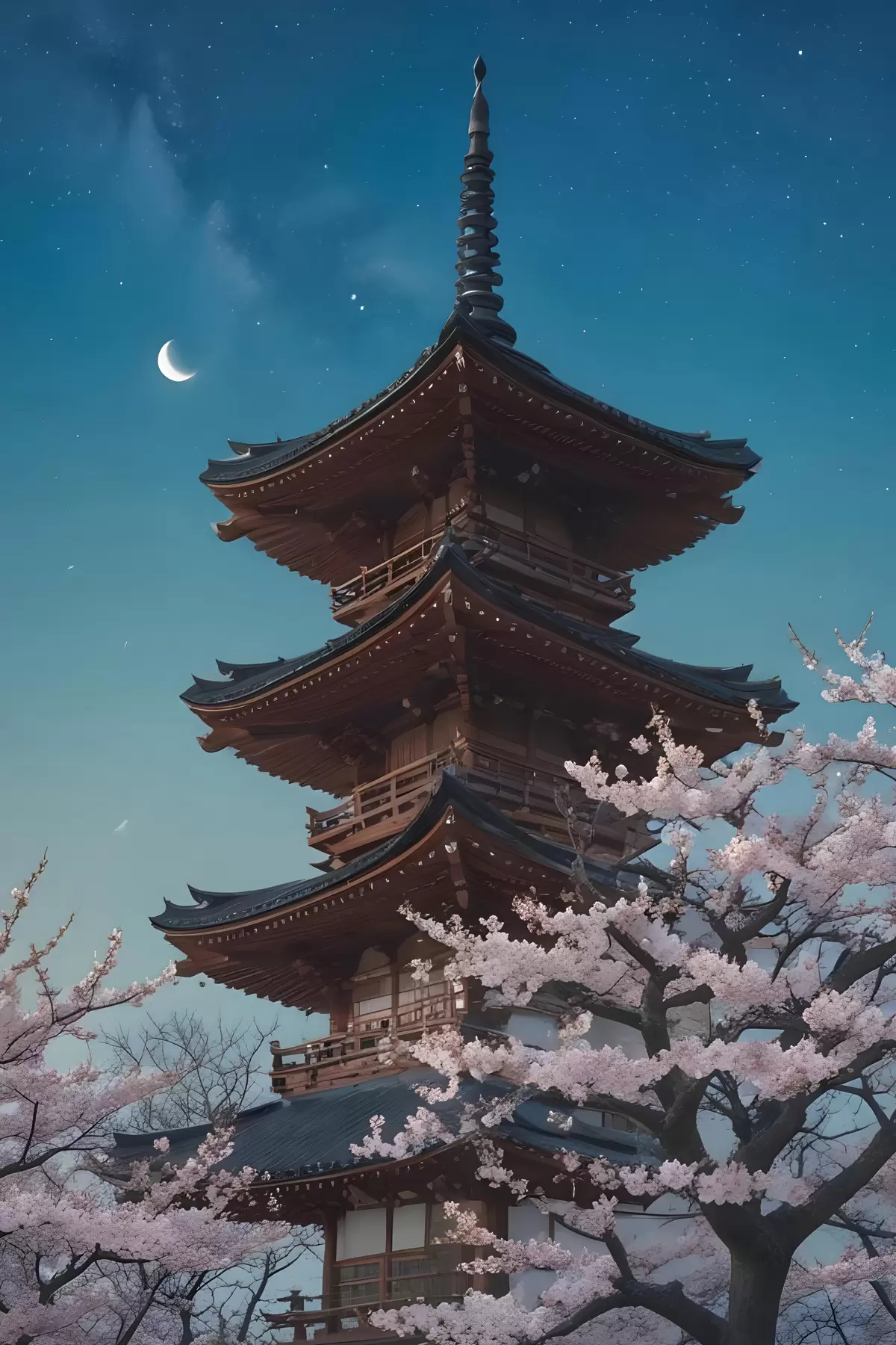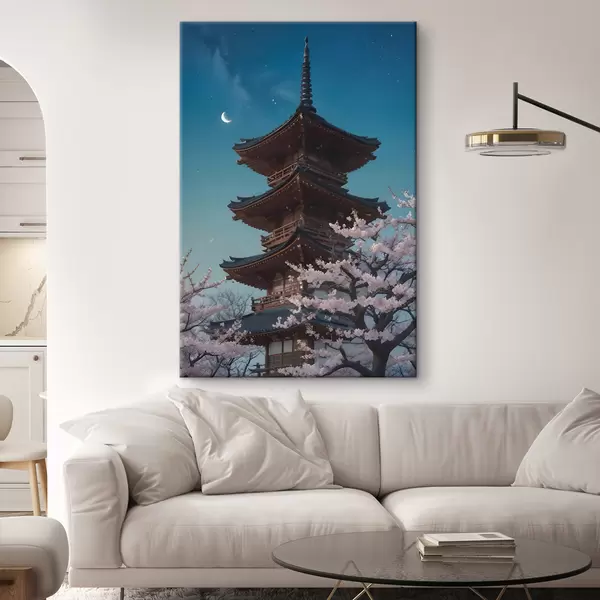 Picture A traditional Japanese pagoda with a crescent moon in the sky with blooming cherry blossom trees Nr s40586