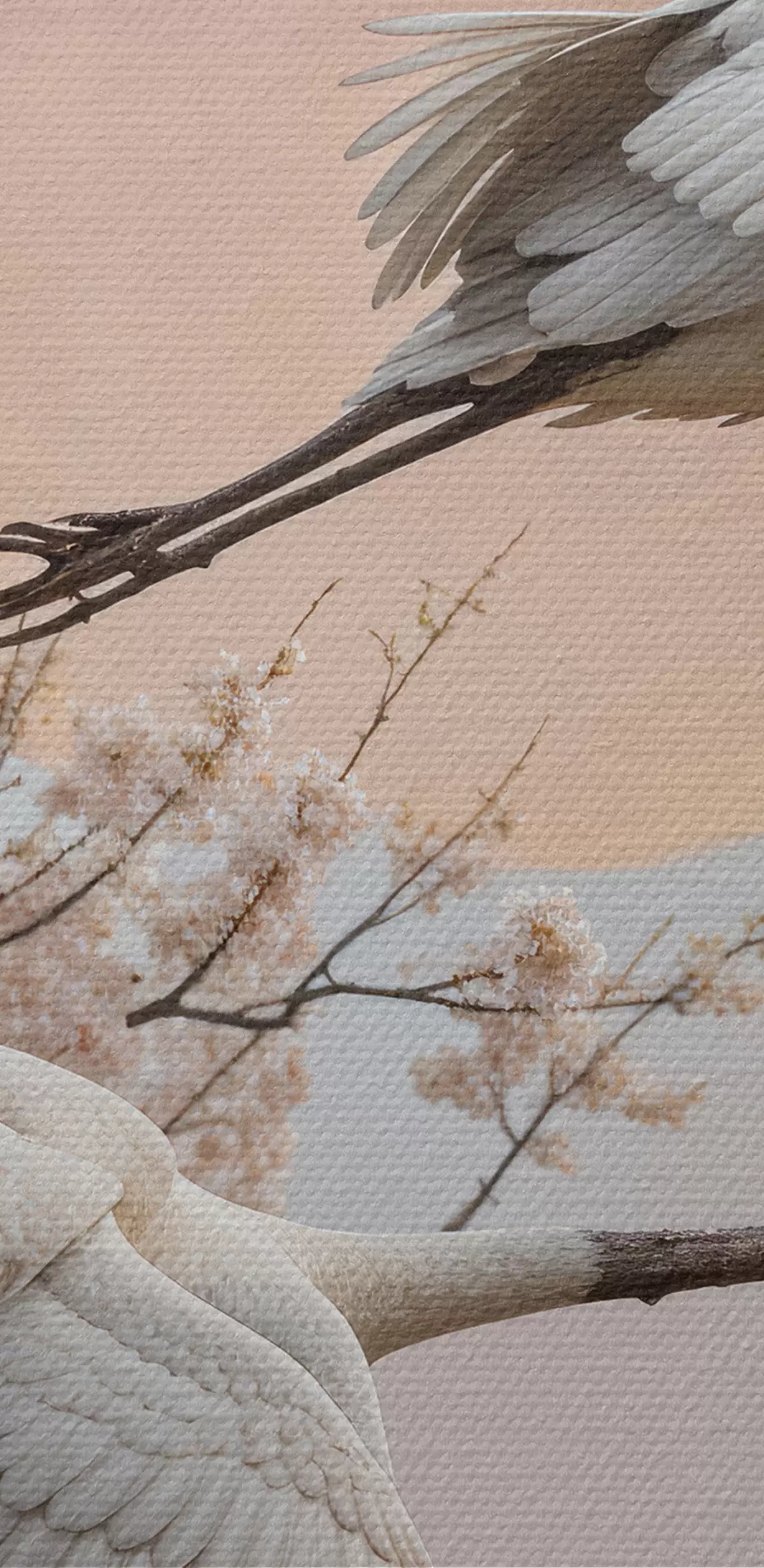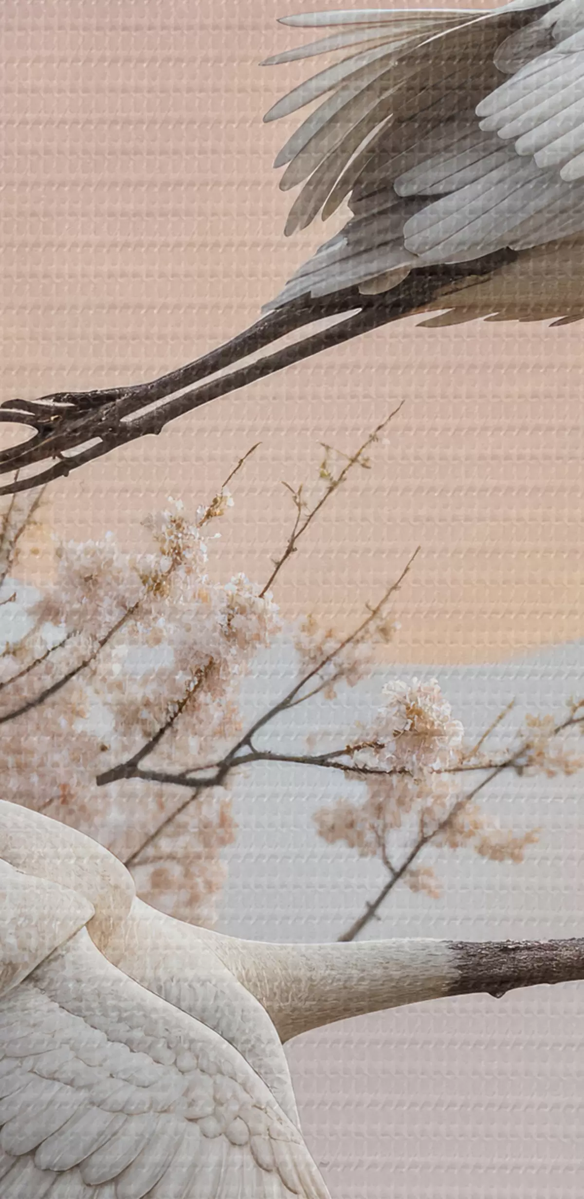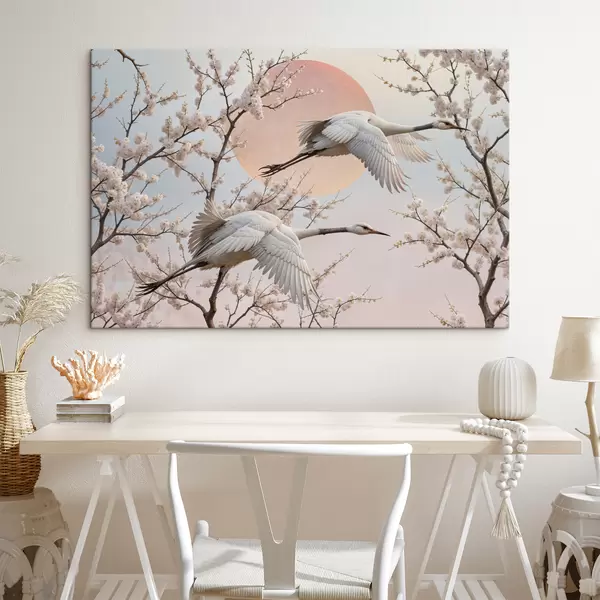 Picture Two white cranes flying among the blooming cherry blossom trees against a pink sunset sky Nr s40601