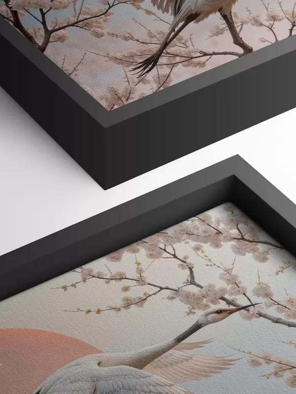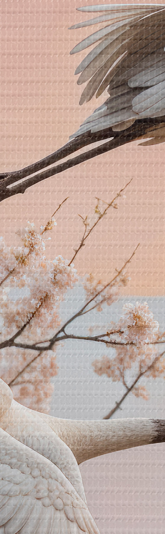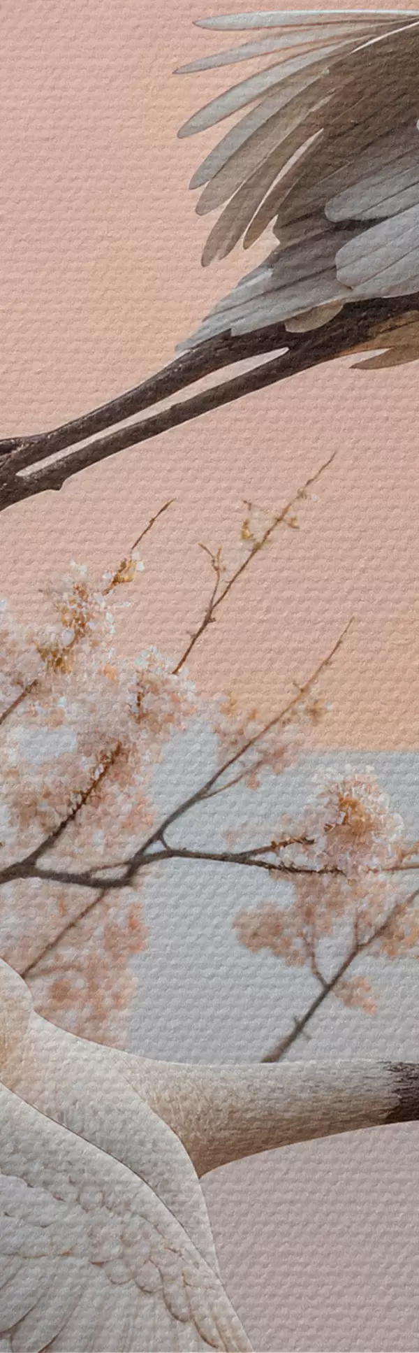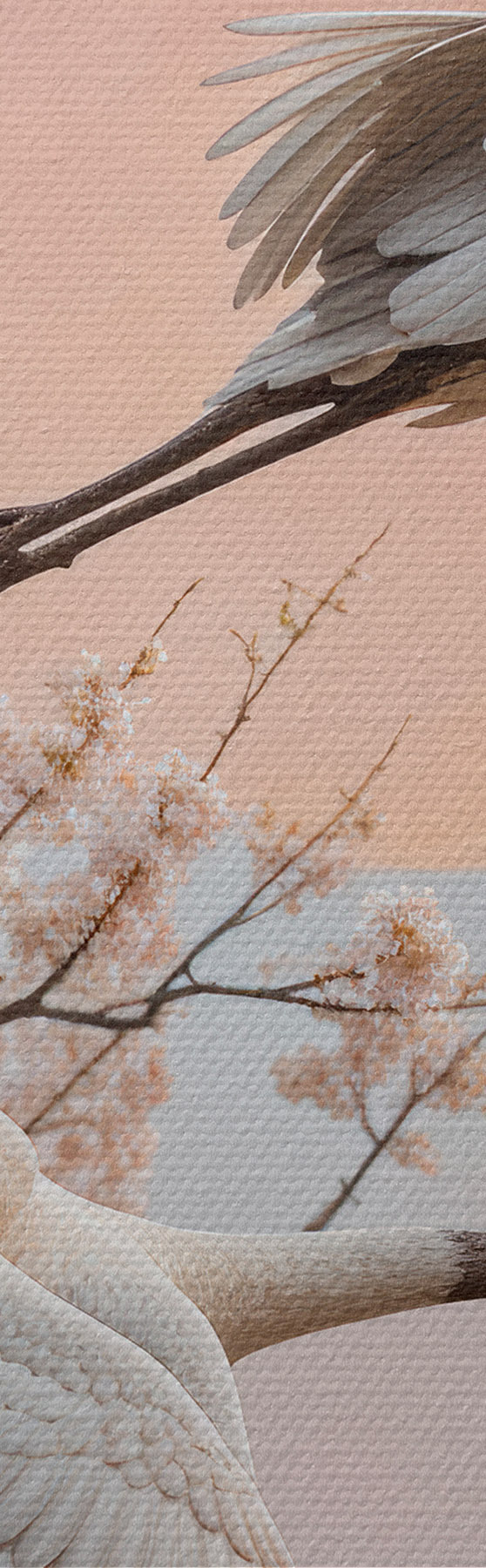 Picture Two white cranes flying among the blooming cherry blossom trees against a pink sunset sky Nr s40601